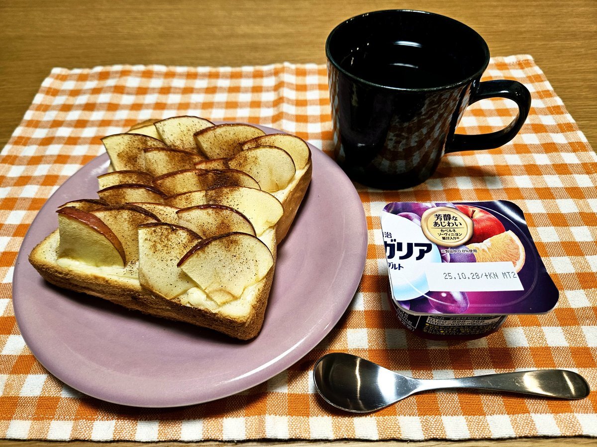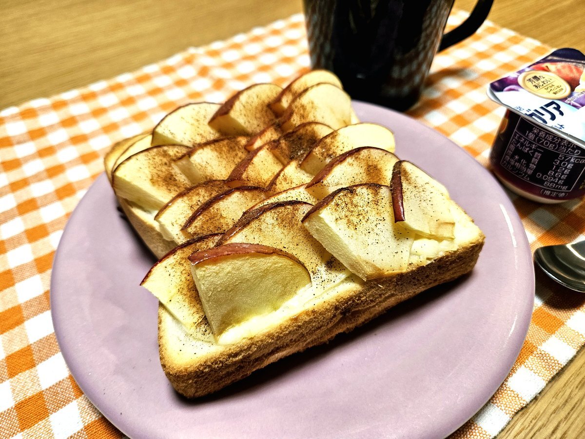 映えないであろう今日の仕事終わりの独り暮らしお夜食🍚 『シナモン香る りんご🍎とクリームチーズのフルーツトーストと紅茶(ダージリン)セット』 いただきます。 #手料理 #手料理日記 #男飯 #フルーツトースト pic.x.com/zSNRSwsDSM