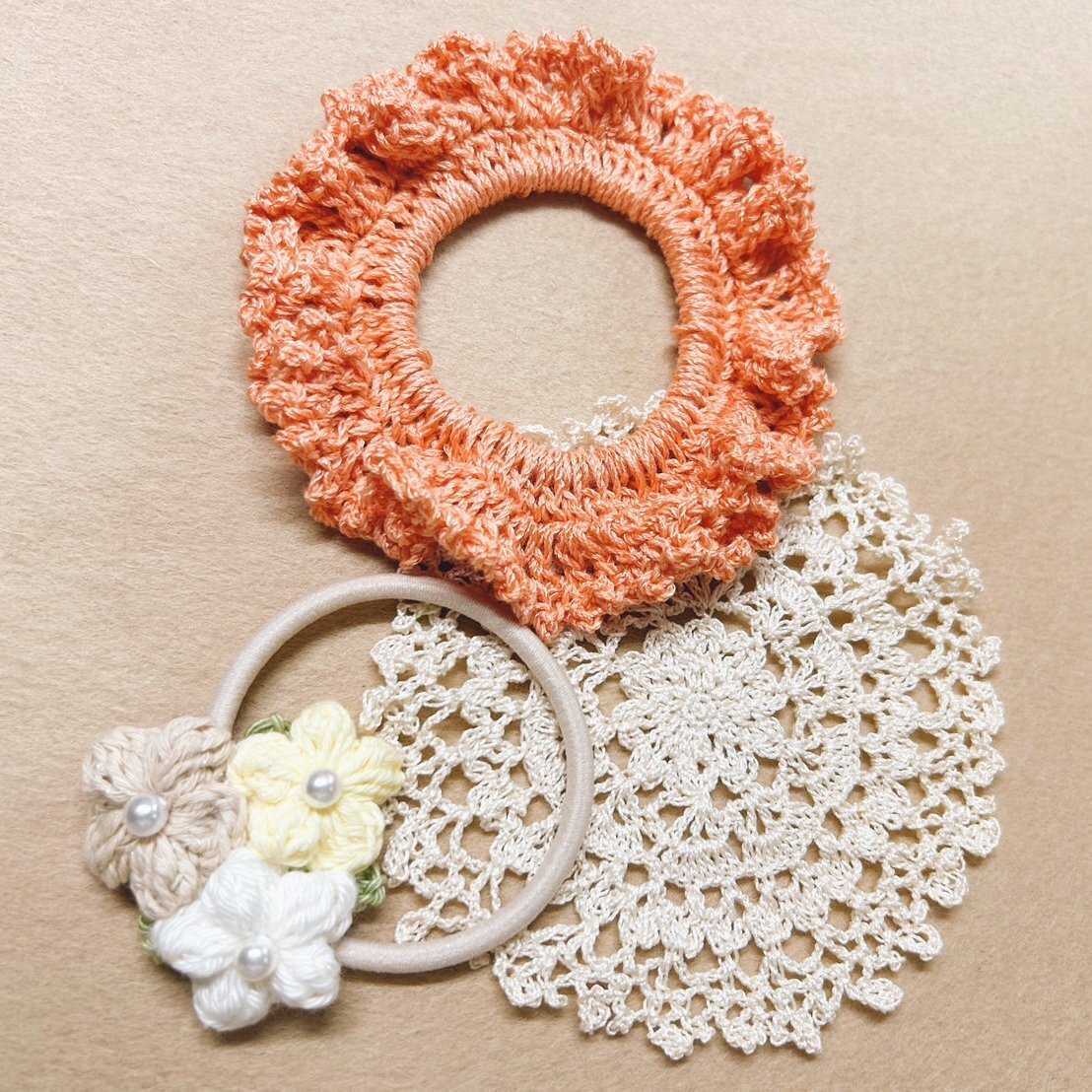 🧶作品紹介🧶 オレンジフリルシュシュ ・3-4号 サマーヤーン ・リングゴム お花のヘアゴム ・4号 コットンヤーン ・リングゴム ・6mmパールビーズ 毛糸の色や花の種類を変えて季節ごとに個性を出してもGood!!(・ω・)b #編み物好きさんと繋がりたい #手芸の店もりお本店 #もりお桜木店 pic.x.com/UTWX3As0yV