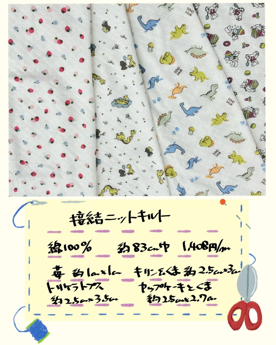 👶🏻生地紹介🍼 接結ニットキルトのご紹介♪ 可愛いちご🍓キリンくま🦒🐻デディベア🧸恐竜🦖のベビー柄4種です✨ スタイやロンパースにどうぞ〜💪✨ 🚚全国配送OK🚚 50cm単位でカット♪ 気軽にお問い合わせ下さい✨ morio-hobby.com #ハンドメイド #手芸 #手芸の店もりお本店 #もりお桜木店 pic.x.com/NfnypWUruv