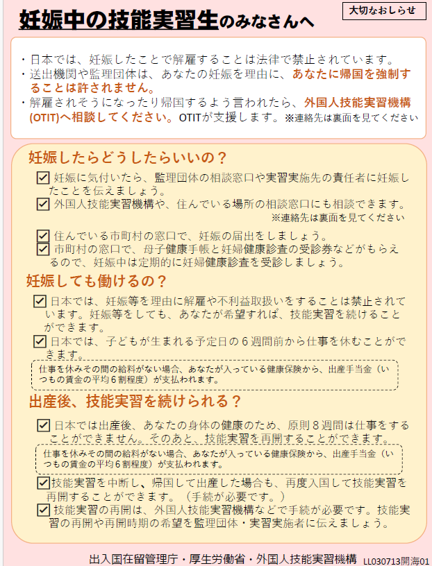 技能実習生が妊娠しても安心してください。手厚い支援が受けられます。さらにベトナム語、中国語、インドネシア語・・・多言語での相談も対応!そりゃぁ、日本で作って産もうか、となっても不思議はないですよね。