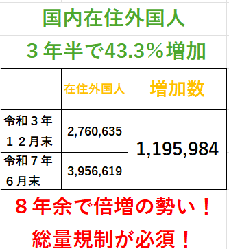 ★3年半で約120万人の外国人激増!★  日本の歴史が始まって以来、最多の外国人激増!  3年半で2,760,635人から3,956,619人と1,195,984人と43.3%も外国人が激増!  この調子で行くと8年余りで約2倍に。