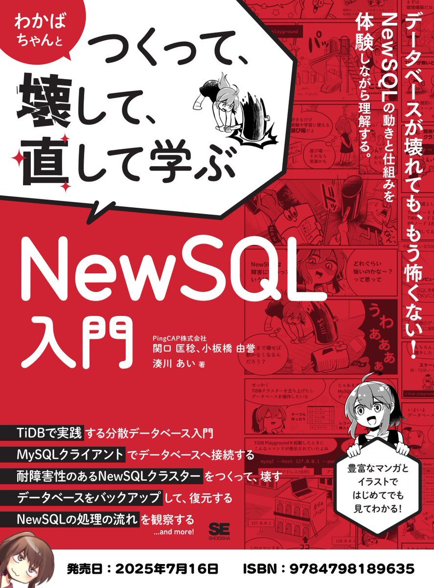 お待たせしました!わかばちゃん新作です。 『わかばちゃんとつくって、壊して、直して学ぶ NewSQL入門』#翔泳社 産後復帰1作目の解説漫画です🎉 技術解説は、TiDBの開発元 PingCAP株式会社の関口匡稔と小板橋由誉さんです。 硬派な技術を、やわらかく学ぼう! Amazon👇 amzn.to/3ZlSZya