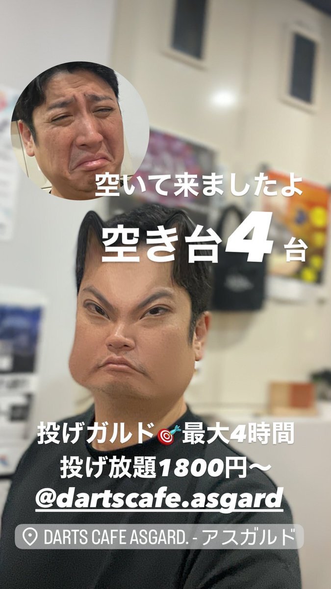本日も11:00よりOPENしております🎯 当店はダーツライブ2 2台、ダーツライブ3 2台を完備しております🥰 投げ放題のみのご案内なので獣王501沢山プレイして、限定のファンダーツをゲットしましょう〜🥰 皆様のご来店お待ちしております🤝 #ダーツ #投げ放題 #カフェ #バー #ダーツバー #蕨 pic.x.com/KWXkb6RykL x.com/dartslive/stat…