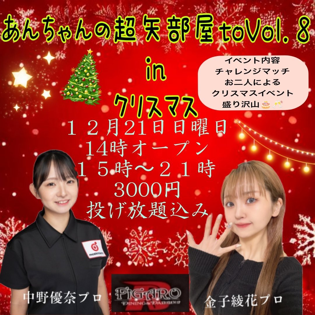 情報解禁! 金子綾花プロのイベントあんちゃんの超矢部屋toVol.8ゲストは2回目の登場、中野優奈プロです✨ イベント内容は、チャレンジマッチ、お二人によるクリスマスイベントが盛り沢山です! エントリーはDMか、店舗TELまでお願い致します🙇 #ご新規様大歓迎 #お一人様大歓迎 #投げ放題 pic.x.com/uRXyAaAaZp