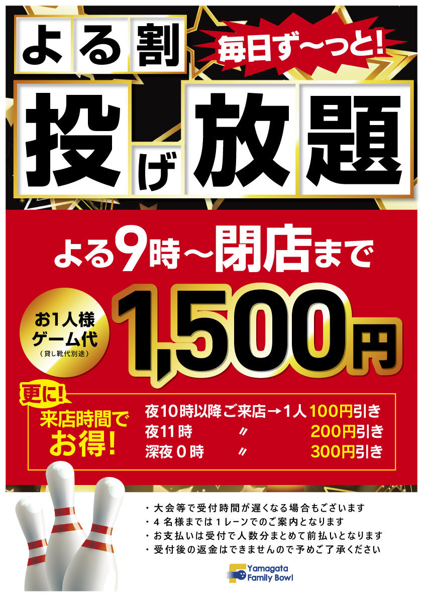こんばんは🍎 今夜も夜9時から【よる割投げ放題】開始😆寒さをぶっ飛ばせ‼️ 来店時間によりもっとお得に⁉️ 🎺【22:00以降〜100円引き】 🪂【23:00以降〜200円引き】 🐦【0:00以降〜300円引き】 皆様のご来店お待ちしております☝️ #山形ファミリーボウル #投げ放題 pic.x.com/8hrvqLJWMs