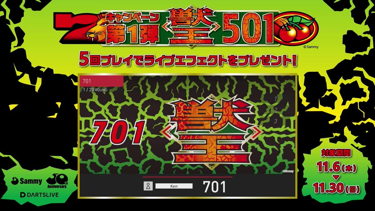 限界突破! サミーオールスターズ★フェス 第1弾は本日よりスタート👽 コラボゲーム『獣王 501』が登場します🔥 たくさんプレイして限定ライブエフェクトをゲットしよう! dartslive.com/jp/campaign/sa… ■期間 11/6(木)~ 11/30(日) ■対象マシン ダーツライブ3 ■プレイ特典