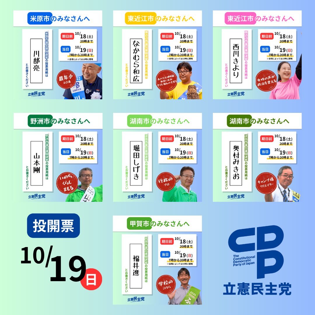 明日10月19日投票日 滋賀県内市会議員選挙 東近江市 湖南市 甲賀市 米原市 野洲市 #投票へ行こう #立憲民主党がんばれ x.com/rikken_shiga/s…