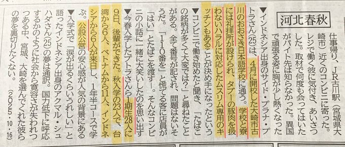 今年3月に宮城県大崎市に外国人向けの日本語学校が設立された。 「大崎市立おおさき日本語学校」 公立学校です。 在籍する留学生には授業料の50%、学生寮家賃の50%、生活支援金月額30,000円が支援金として交付されます。