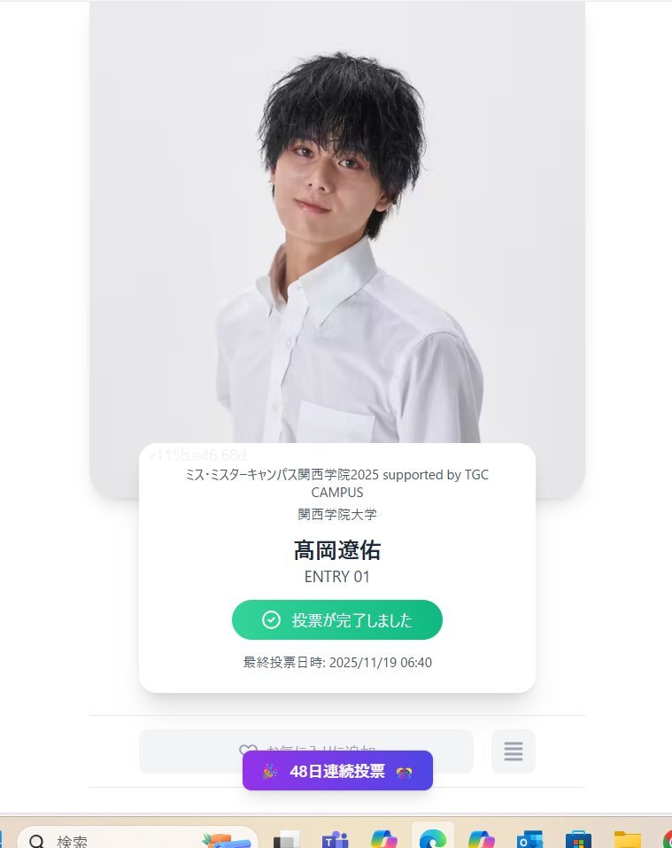 おはようございます😊 今日もよろしくお願いします🙇 ミス・ミスターキャンパス関西学院2025 supported by TGC CAMPUS #髙岡遼佑 さんへの #1日1回の無料投票 で応援📣 〜引用元ポストに #投票所 あります🗳️~ 投票しました(11月19日、48日連続)💻 pic.x.com/ZmLd5oSkBJ x.com/mckg25_mr1/sta…