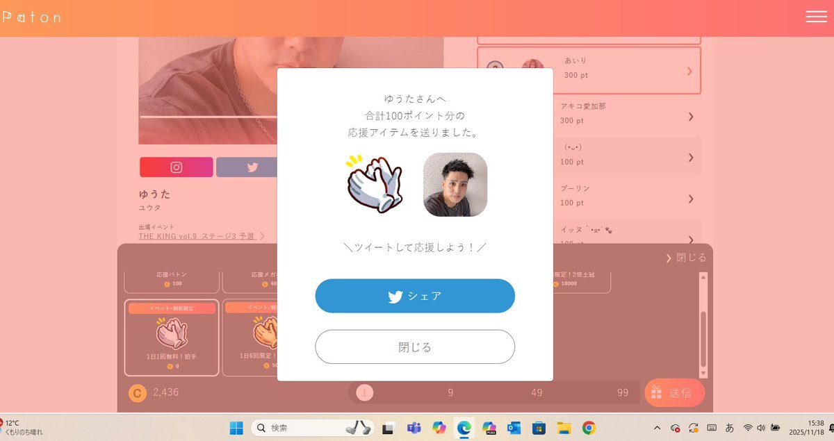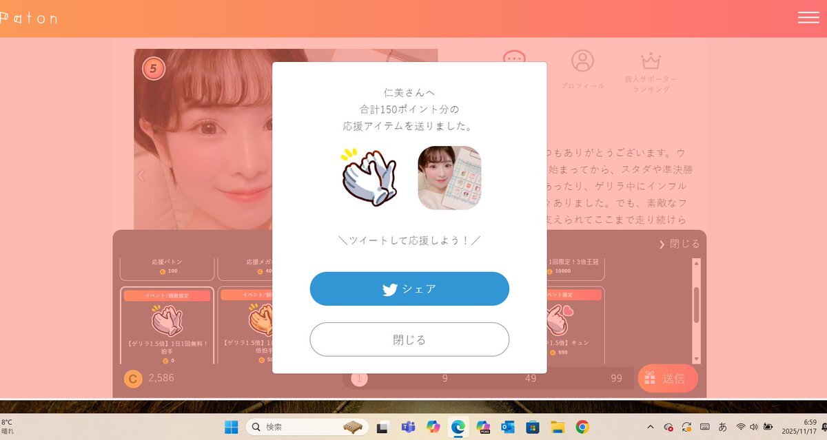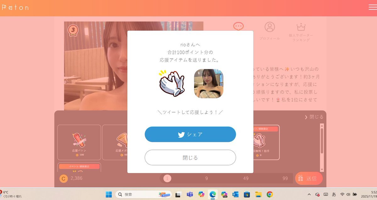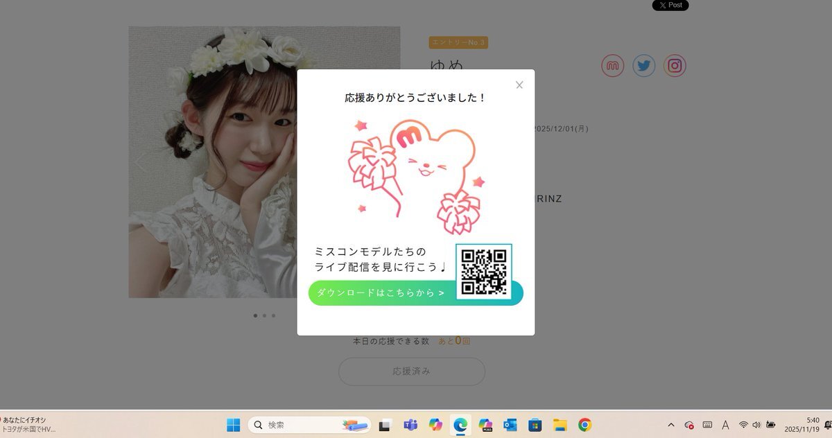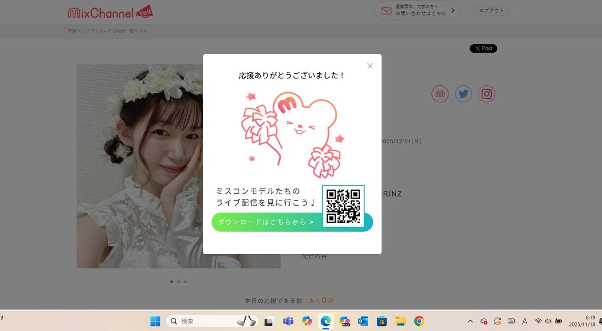 おはようございます😊 ミクチャリーグ(#KIRINZ) 1日1回無料の #エール投票 で ゆめさんへの応援よろしくお願いします🙏 〜引用元ポストに #投票所 あります🗳️🙇~ 投票しました(11月19日、5時40分)💻右下日時 pic.x.com/KnOUluQWKL x.com/yume_liver/sta…