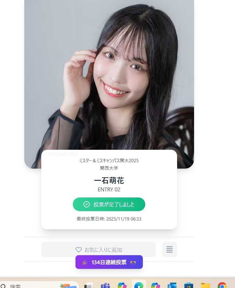 おはようございます😊 今日もよろしくお願いします🙇 #もえぽち(残り3回!) ミスター&ミスキャンパス関大2025 関西大学 #一石萌花 さんへの #1日1回の無料投票 で応援📣 〜引用元ポストに #投票所 あります🗳️~ 投票しました(11月19日、134日連続)💻 pic.x.com/9aB0lLbCzJ x.com/kandai25_miss2…