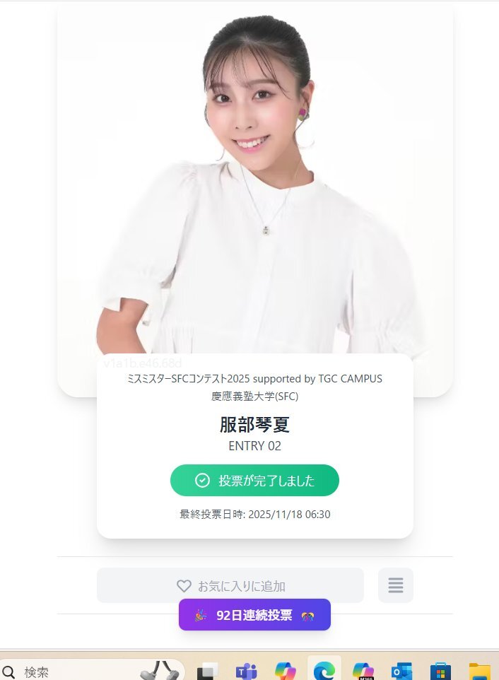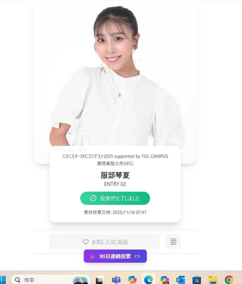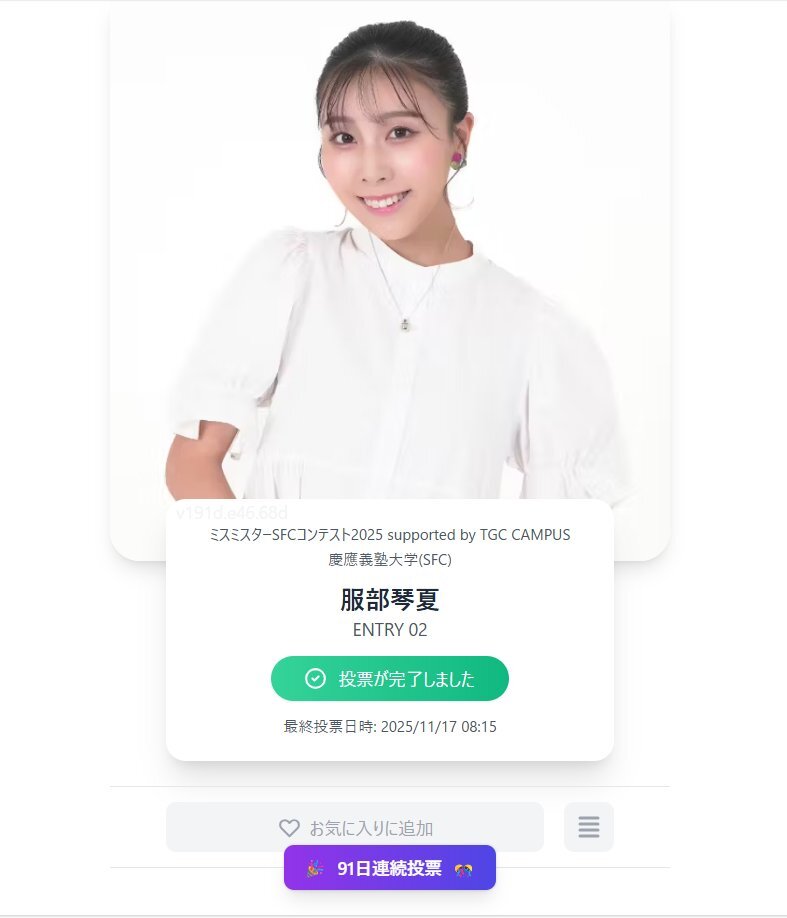 おはようございます😊 今日もよろしくお願いします🙇 #ことポチ ミスミスターSFCコンテスト2025 supported by TGC CAMPUS 慶應義塾大学(SFC) #服部琴夏 さんへの #1日1回の無料投票 で応援📣 〜引用元ポストに #投票所 あります🗳️🙏~ 投票しました(11月18日、92日連続)💻 pic.x.com/x4kUc5Rsfu x.com/misssfc2025_02…