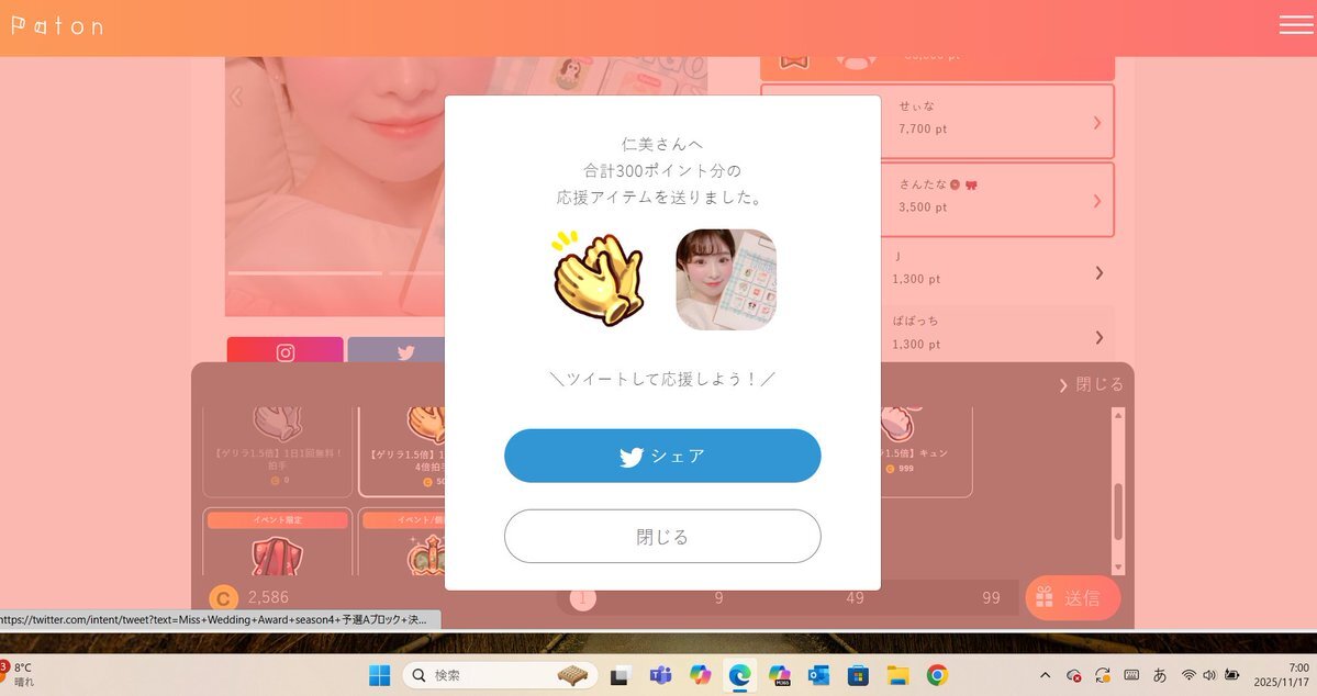 パトン投票報告所5日目(11/18) 遅くなりました🙇♀️💦 いつも投票ありがとうございます🫧 このまま1位で進みたいです!本日もよろしくお願いいたします⸜🌷︎⸝ paton.jp/event/entrant/…