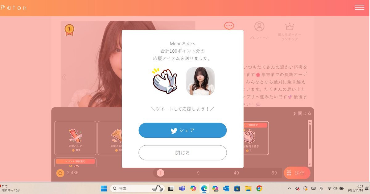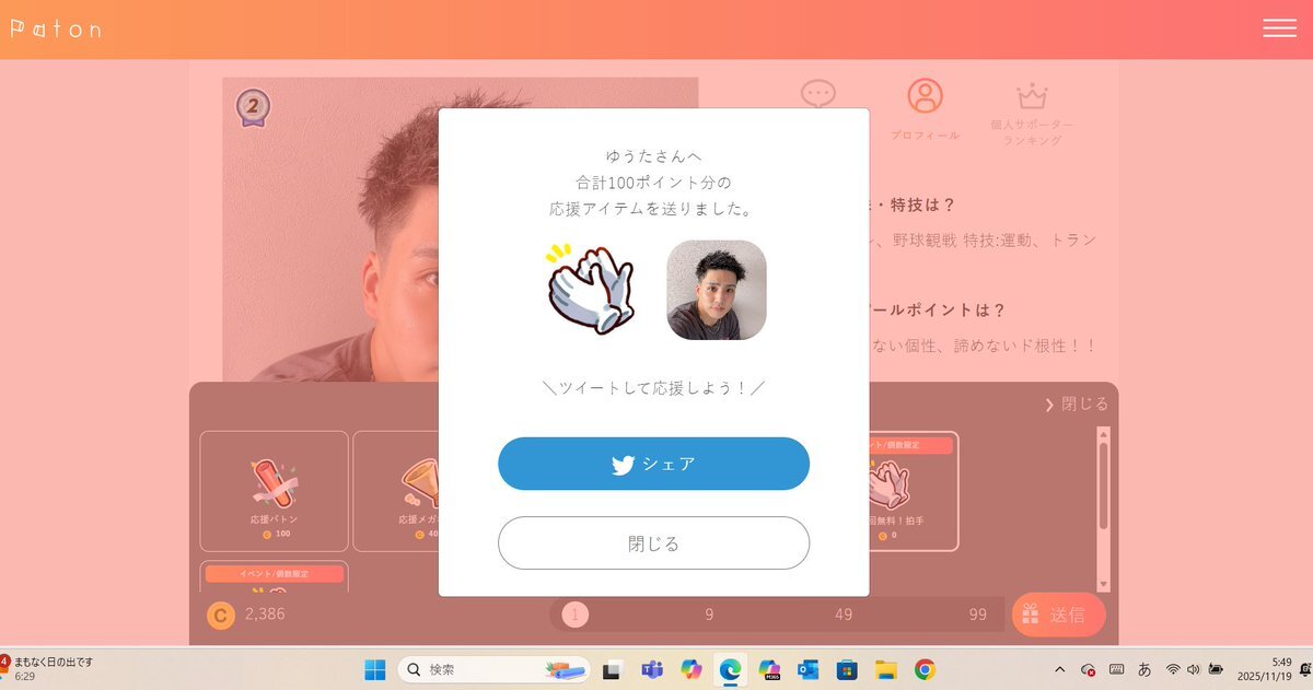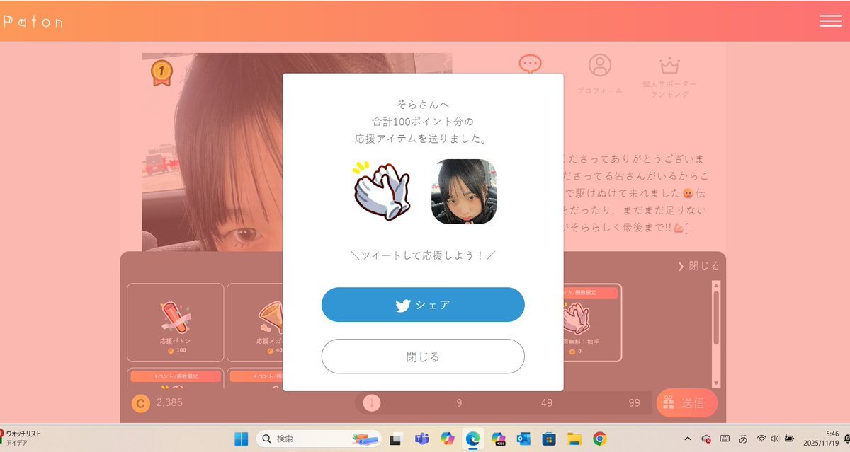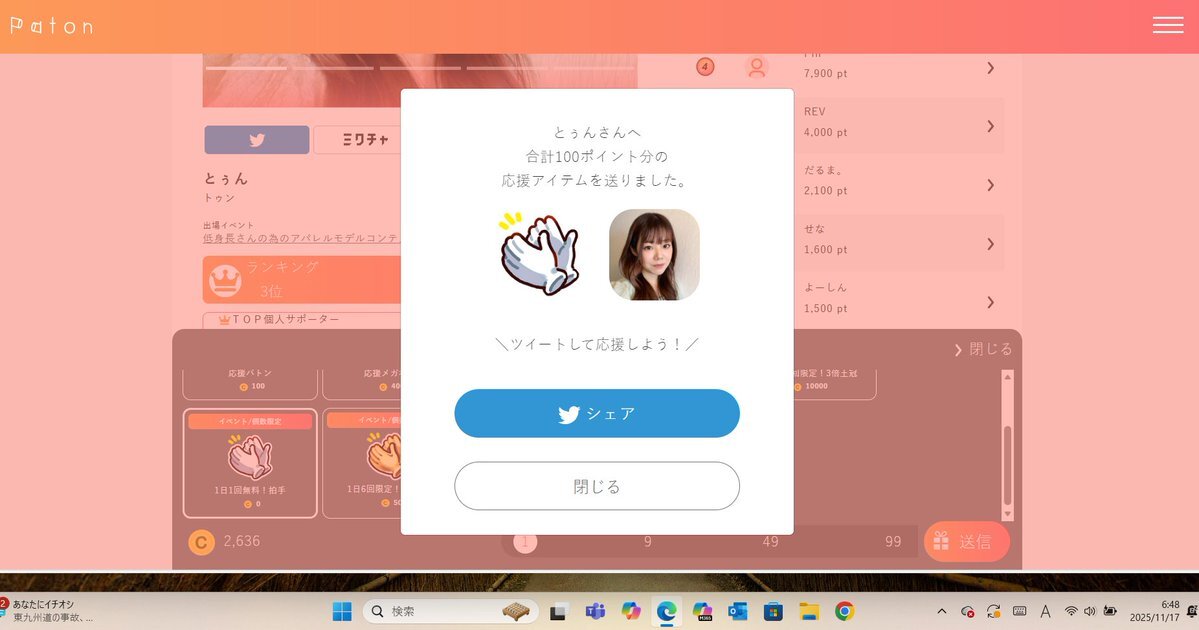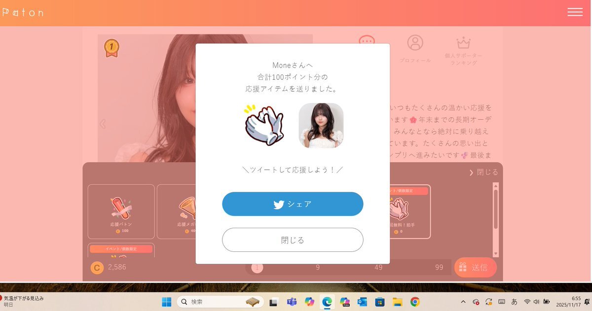 パトン投票報告所5日目(11/19) みんなの支えで本日もなんとか1位キープ✨ 気力も必要なパトンを毎日ありがとうございます🤍🫧 最後まで1位目指して頑張ります!よろしくお願いいたします❣️ paton.jp/event/entrant/…