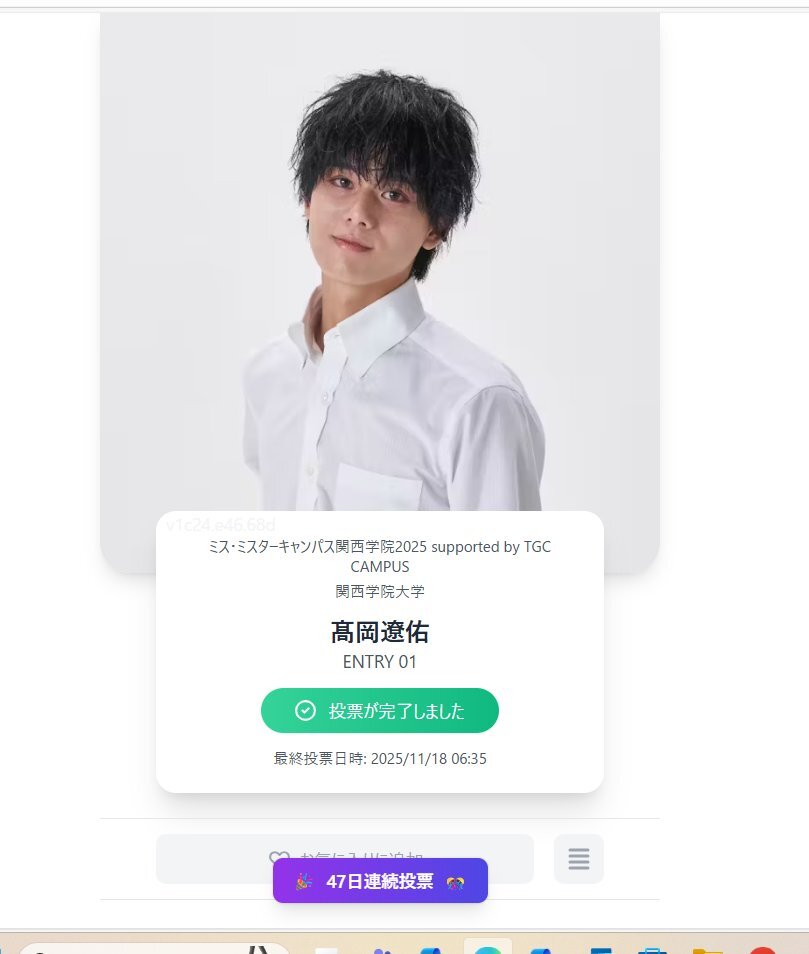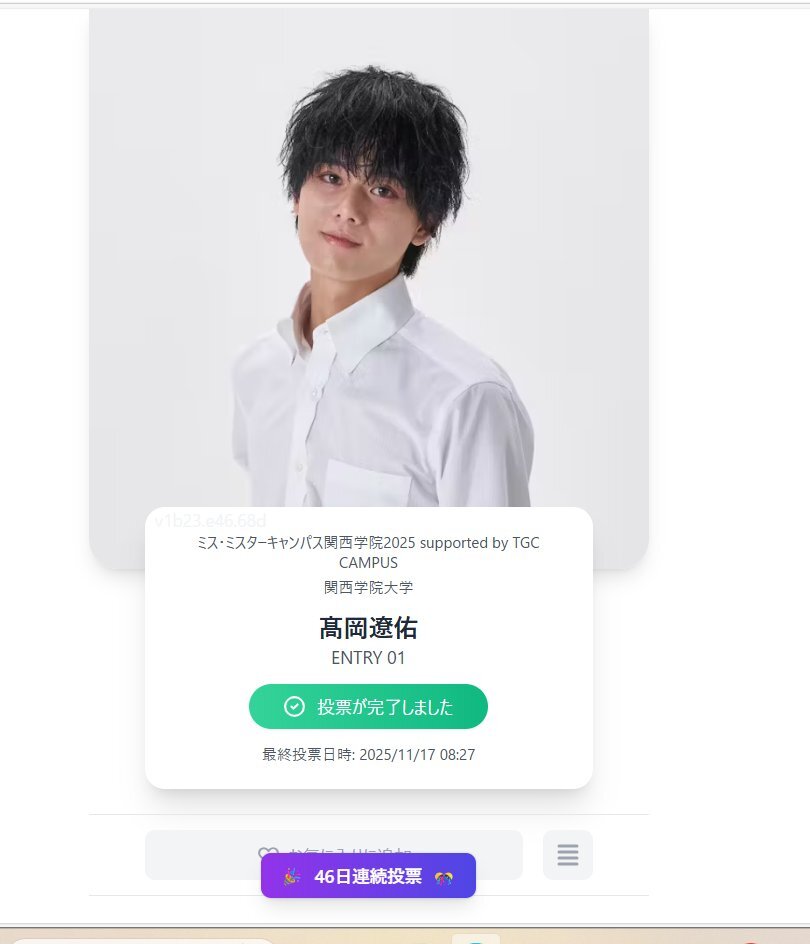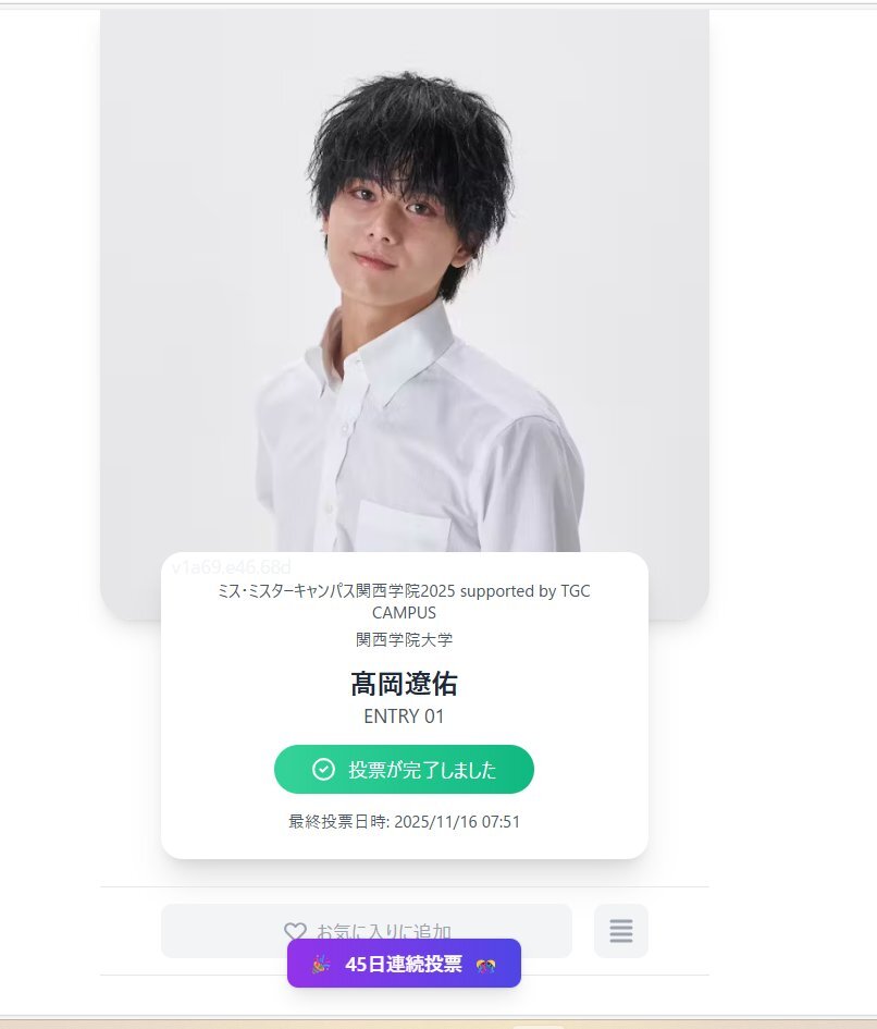 おはようございます😊 今日もよろしくお願いします🙇 ミス・ミスターキャンパス関西学院2025 supported by TGC CAMPUS #髙岡遼佑 さんへの #1日1回の無料投票 で応援 〜引用元ポストに #投票所 あります~ 投票しました(11月17日、46日連続)💻 pic.x.com/UYnjb4K5Yt x.com/mckg25_mr1/sta…