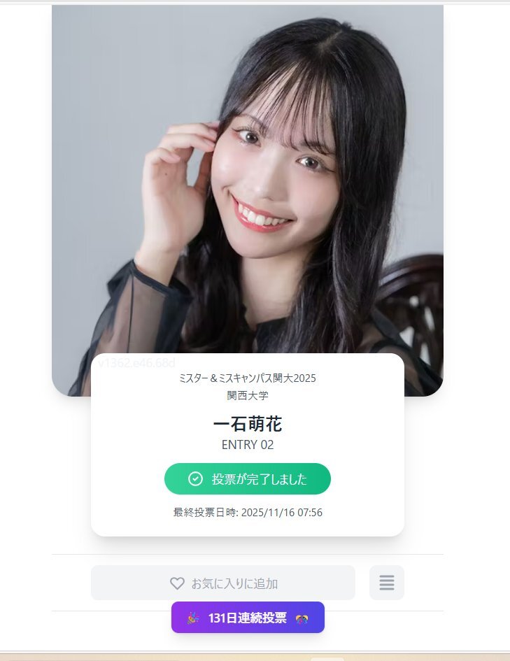 おはようございます😊 今日もよろしくお願いします🙇 #もえぽち ミスター&ミスキャンパス関大2025 関西大学 #一石萌花 さんへの1日1回の無料投票 で応援📣 〜引用元ポストに #投票所 あります🗳️🙏~ 投票しました(11月16日、131日連続)💻 pic.x.com/vLTcKZNPdR x.com/kandai25_miss2…