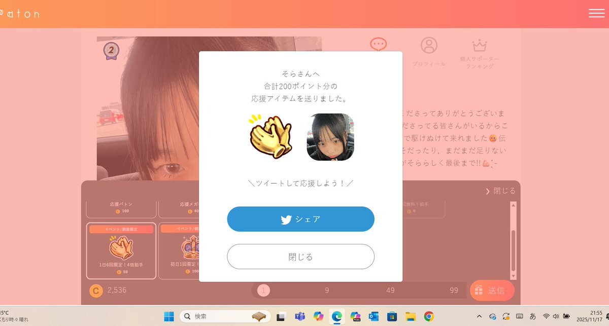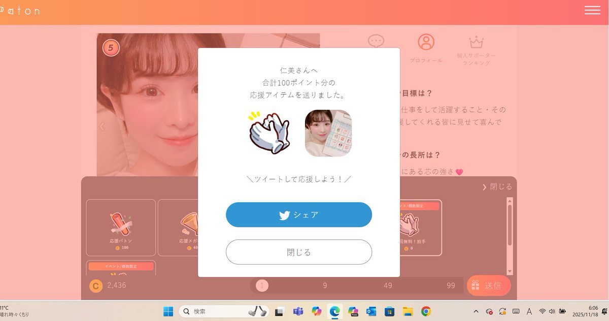 皆さん、いつも沢山の応援ありがとうございます🙇🏻՞ 本日よりパトン投票がはじまりました! 期間11/18(火)~11/25(火) 1日300票目標にしてます!! ご協力いただけると嬉しいです✨ paton.jp/event/entrant/…