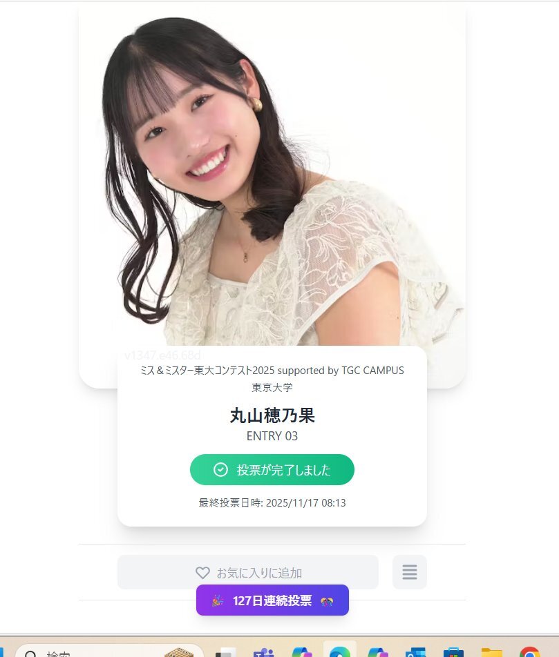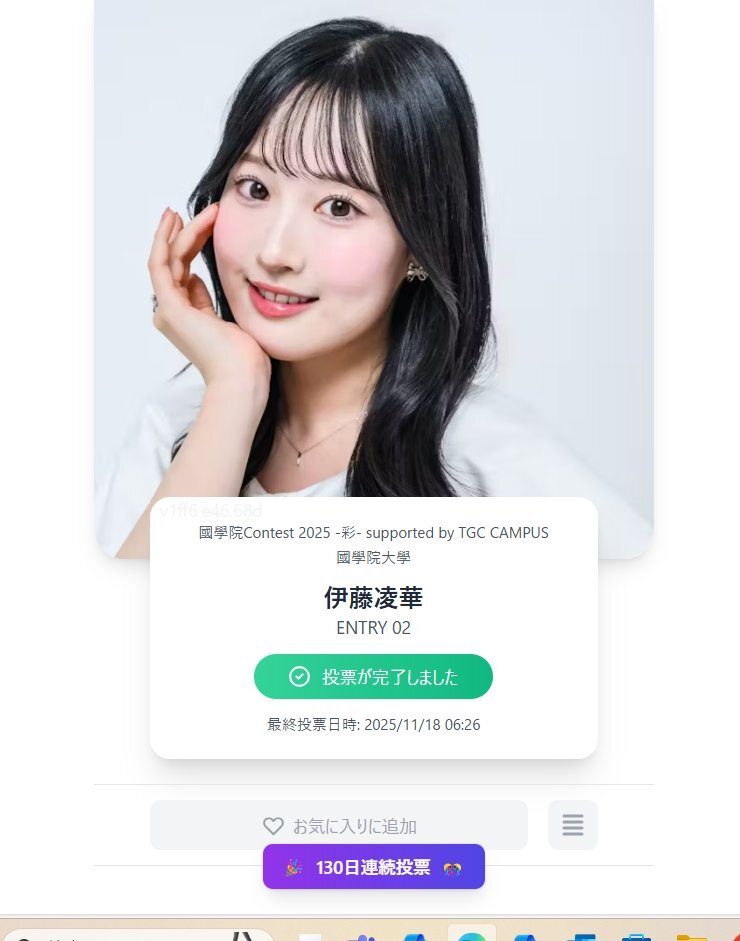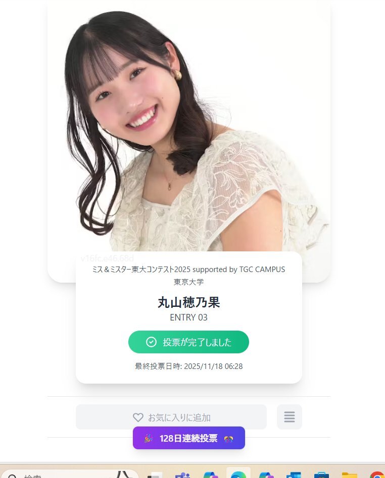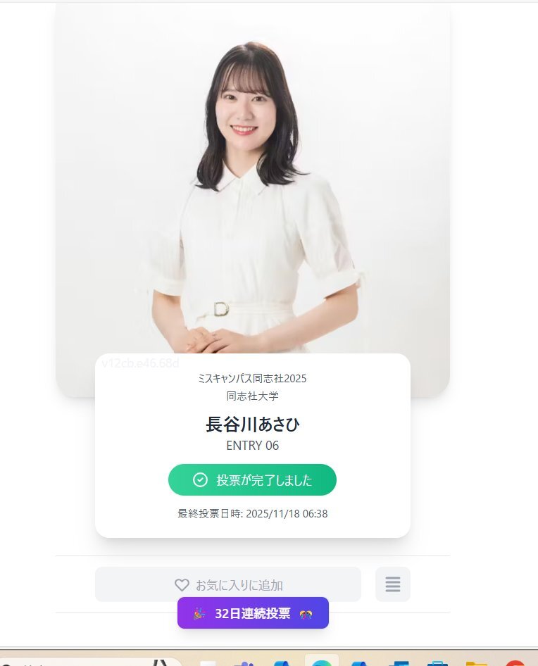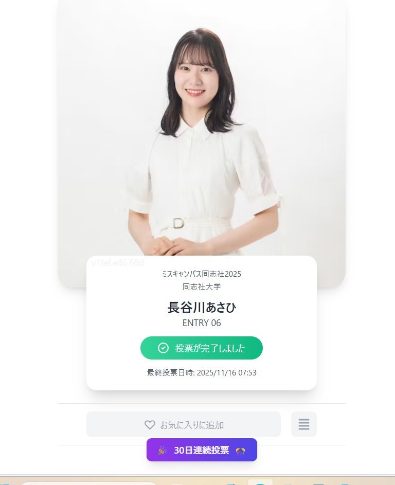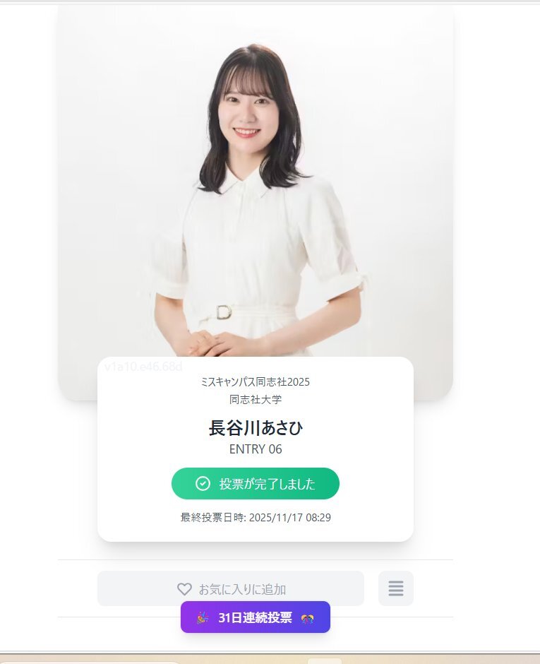 おはようございます😊 今日もよろしくお願いします🙇 ミスキャンパス同志社2025 #長谷川あさひ さんへの #1日1回の無料投票 で応援📣 〜引用元ポストに #投票所 あります🗳️~ 投票しました(11月18日、32日連続)💻 pic.x.com/c6l2fbVT8r x.com/mcd2025_ha06/s…