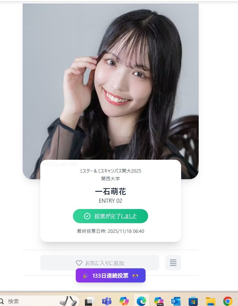おはようございます😊 今日もよろしくお願いします🙇 #もえぽち(残り4回!)🆘 ミスター&ミスキャンパス関大2025 関西大学 #一石萌花 さんへの #1日1回の無料投票 で応援📣 〜引用元ポストに #投票所 あります🗳️🙏~ 投票しました(11月18日、133日連続)💻 pic.x.com/pA50WWarJZ x.com/kandai25_miss2…