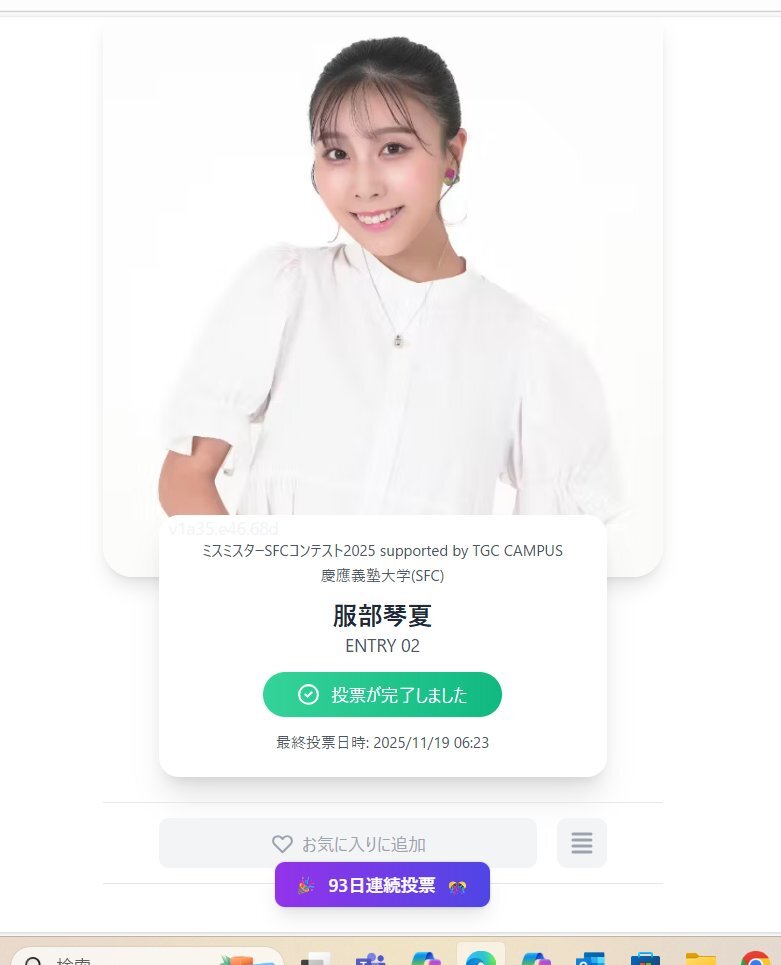おはようございます😊 今日もよろしくお願いします🙇 #ことポチ ミスミスターSFCコンテスト2025 supported by TGC CAMPUS 慶應義塾大学(SFC) #服部琴夏 さんへの #1日1回の無料投票 で応援📣 〜引用元ポストに #投票所 あります🗳️~ 投票しました(11月19日、93日連続)💻 pic.x.com/EeLFPw6KK2 x.com/misssfc2025_02…