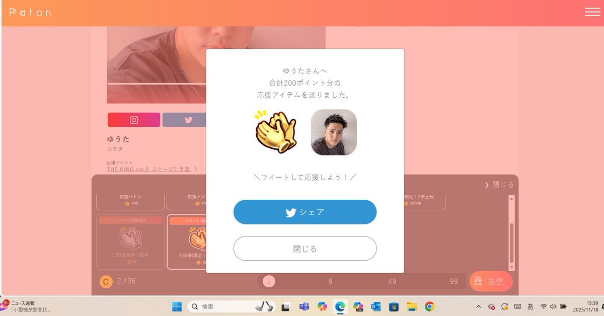 こんにちは😊 今日もよろしくお願いします🙇 #パトン投票(本日から!) THE KING vol.9_ステージ3 予選 開催期間 2025/11/18 12:00 ~ 2025/11/25 23:59 〜引用元ポストに #投票所 あります🗳️~ #ゆうた さんへ 投票しました(11月18日、15時38分&39分)💻右下日時 pic.x.com/nq7OeqahCO x.com/yuta__fit/stat…