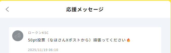おはようございます😊 今日もよろしくお願いします🙇 #エール投票 1日1回 #無料ガチャ で運試し! 獲得ptで #いむ さんへの投票応援📣 【MCC京都】 〜引用元ポストに #投票所 あります🗳️~ 投票終了画面でませんでしたが投票完了 (11月19日、6時10分、50pt😞)💻 (累計 350pt) pic.x.com/vpInmEJoMi x.com/na_ho_241011/s…
