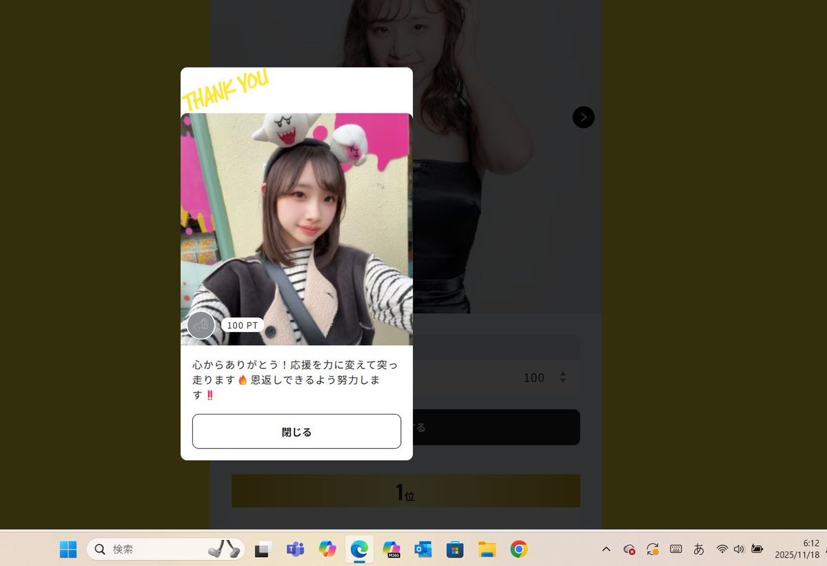 おはようございます😊 今日もよろしくお願いします🙇 #ミクチャリーグ⚡ #ゆめ さん(#KIRINZ) 1日1回無料の #エール投票 で応援📣 〜引用元ポストに #投票所 あります🗳️~ #ゆめ さんへ 投票しました(11月18日、6時19分)💻右下日時 pic.x.com/drb5043Njg x.com/yume_liver/sta…