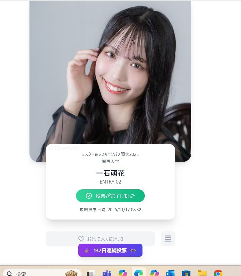 おはようございます😊 今日もよろしくお願いします🙇 #もえぽち(残りわずか!) ミスター&ミスキャンパス関大2025 関西大学 #一石萌花 さんへの #1日1回の無料投票 で応援📣 〜引用元ポストに #投票所 あります🗳️~ 投票しました(11月17日、132日連続)💻 pic.x.com/f0LrGQ6PHi x.com/kandai25_miss2…