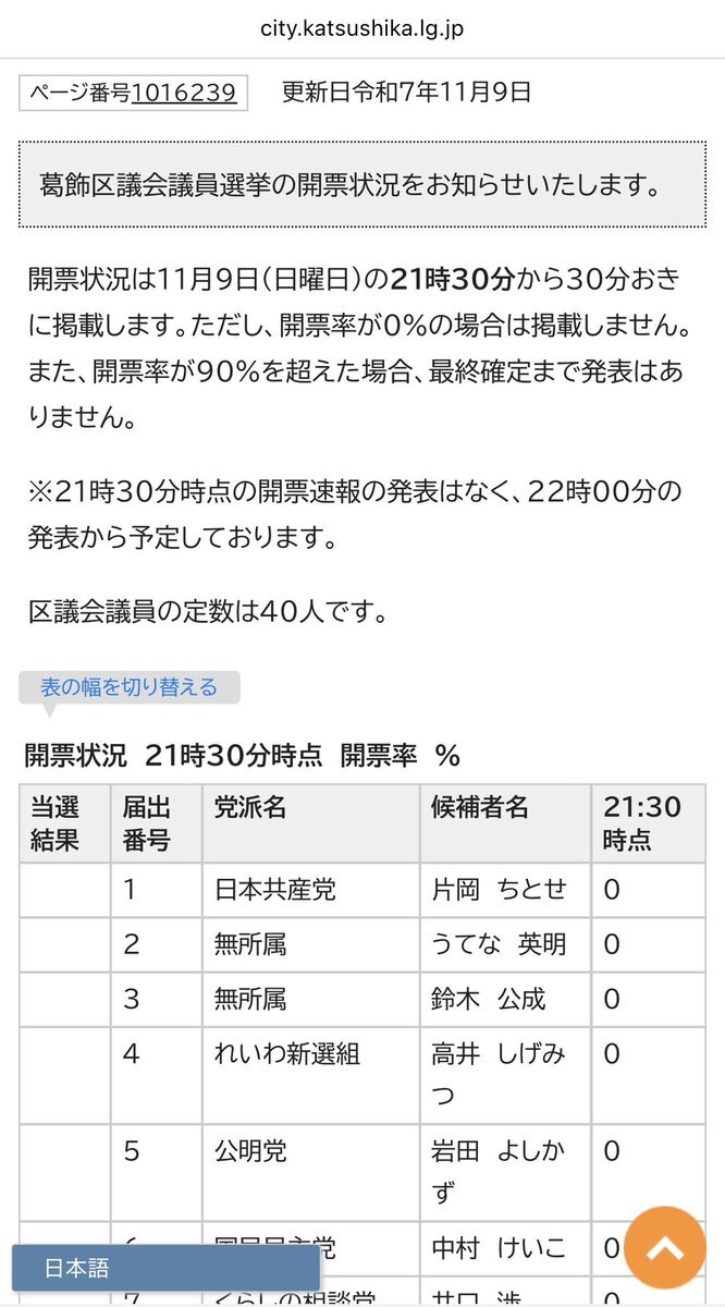 「葛飾区議会議員選挙・葛飾区長選挙 投開票状況」は 葛飾区のホームページで 約30分おきに掲載・更新されるようです! city.katsushika.lg.jp/information/10… #葛飾区議選