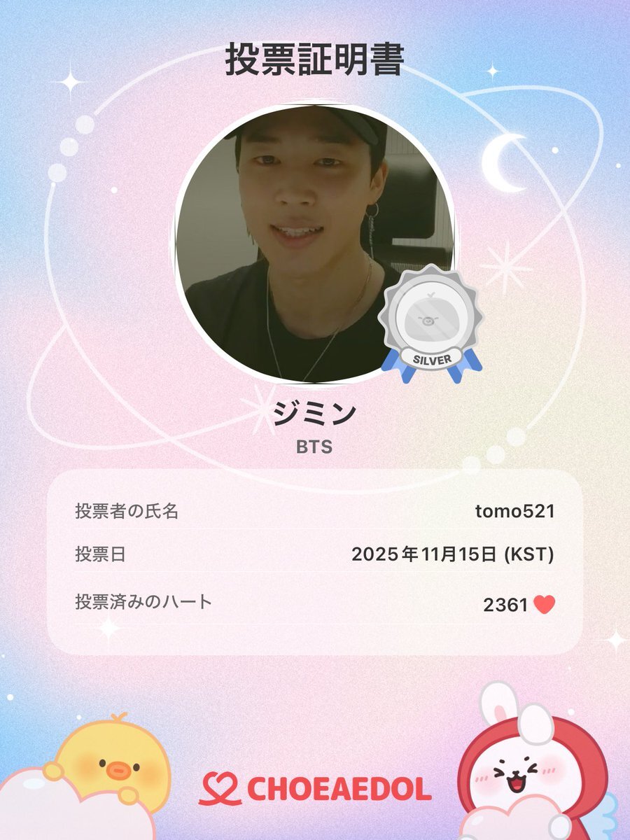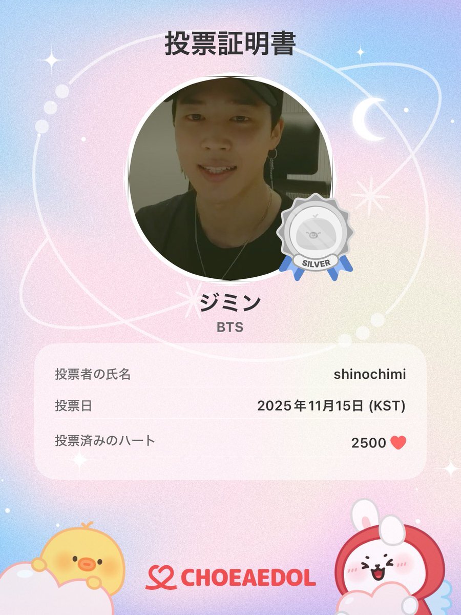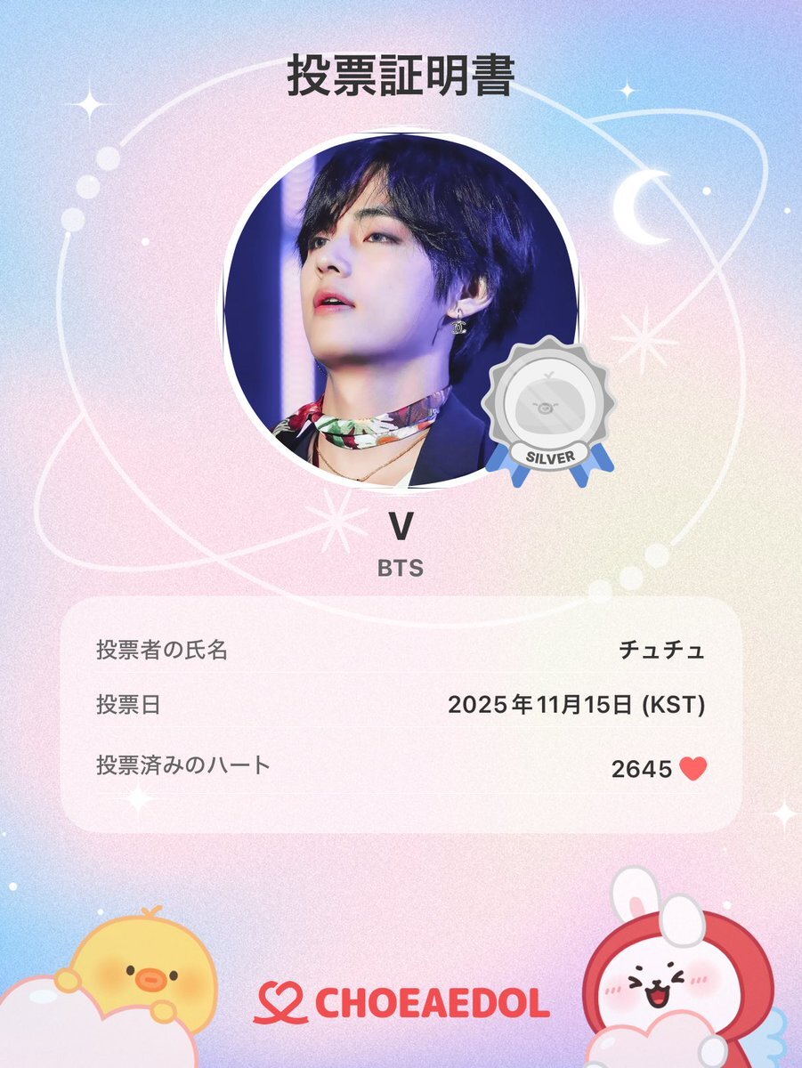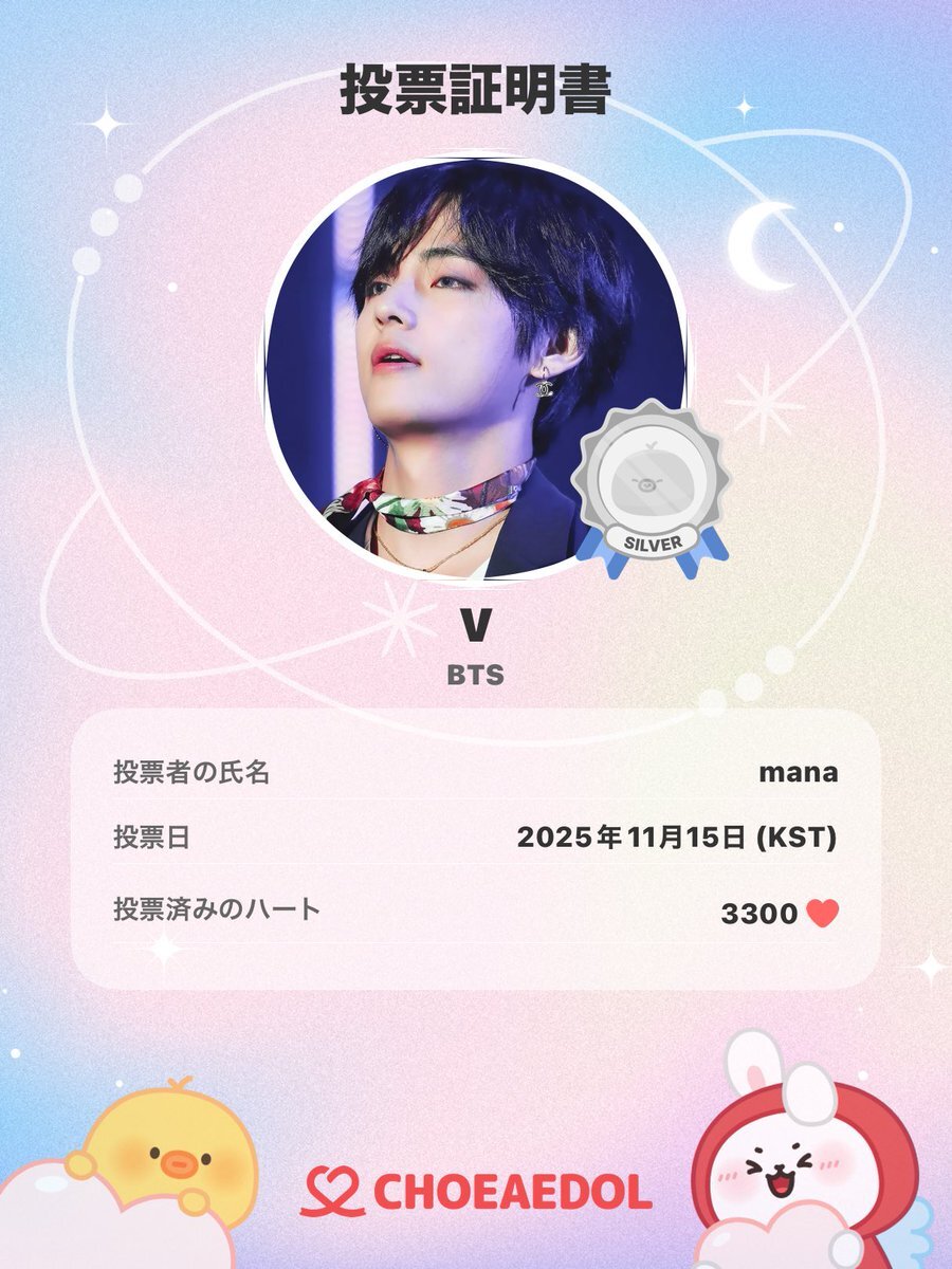 今日も大好き更新🥹♥️✨ 本日投票完了しました💝 一緒に最愛ドルしましょう! #最愛ドル #V_BTS #投票証明 myloveidol.com/community/?loc… pic.x.com/an6GpRuxQf