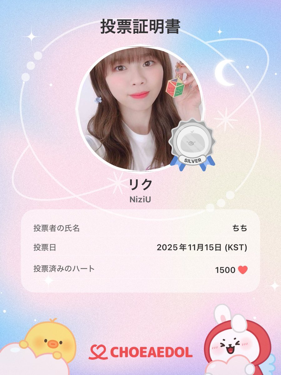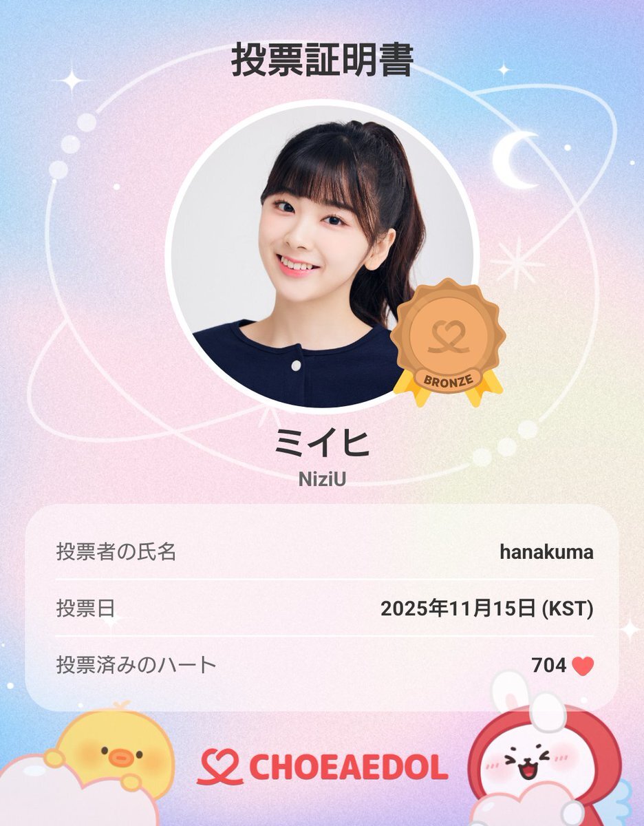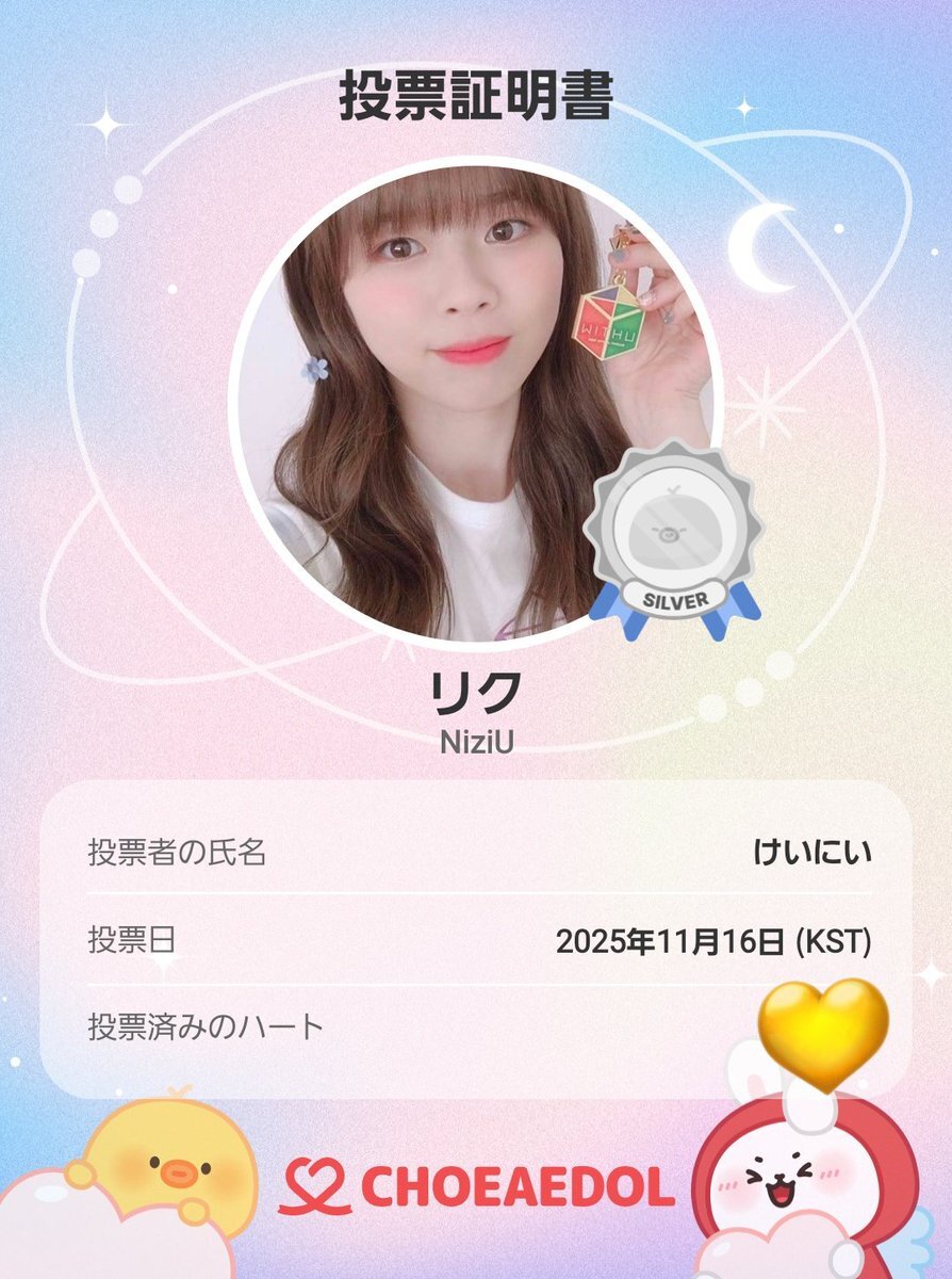 本日投票完了しました💝 一緒に最愛ドルしましょう! #最愛ドル #ミイヒ_NiziU #投票証明 myloveidol.com/community/?ido… pic.x.com/BrGfH7CoFV