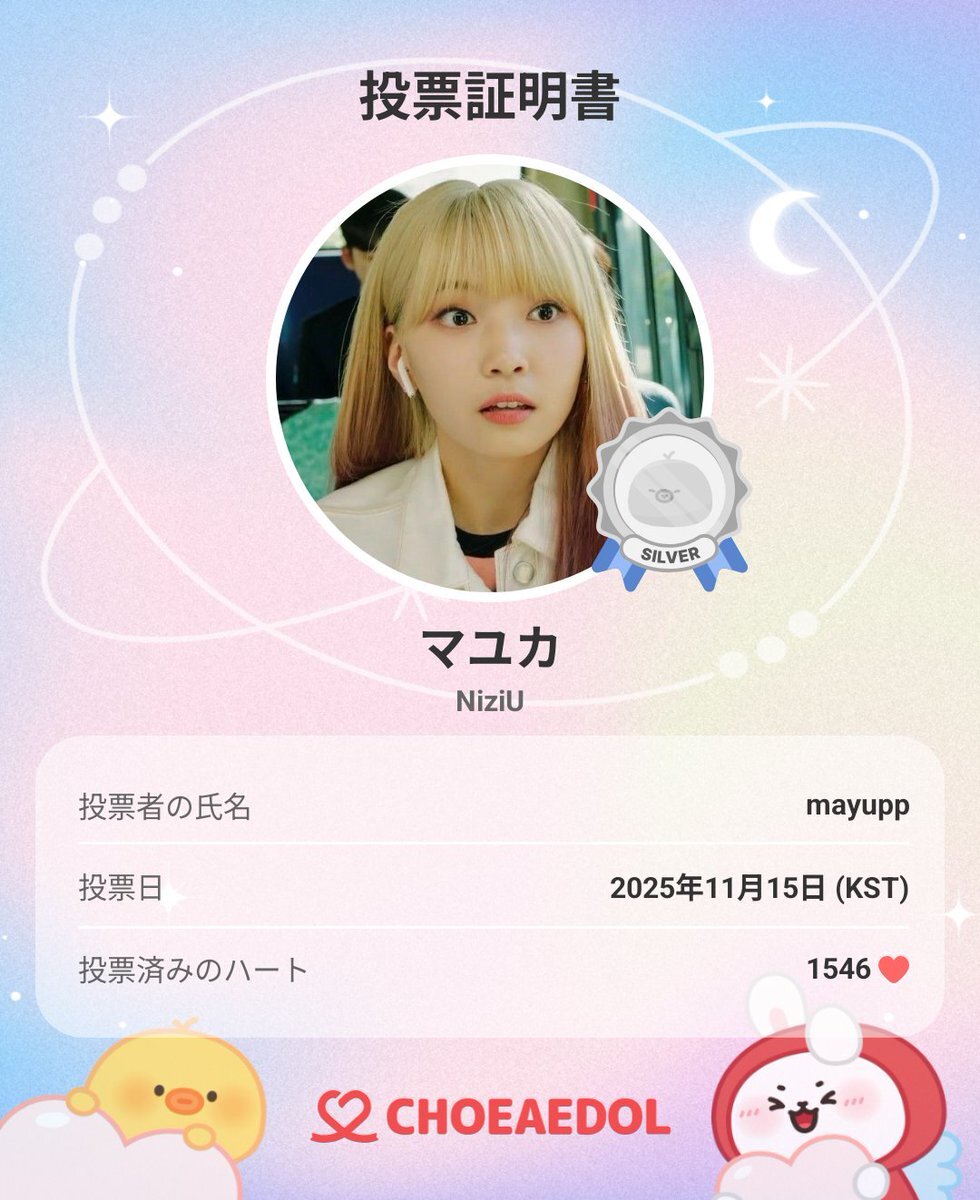 本日投票完了しました💝 一緒に最愛ドルしましょう! #最愛ドル #マユカ_NiziU #投票証明 myloveidol.com/community/?ido… pic.x.com/4PgQW91nt2