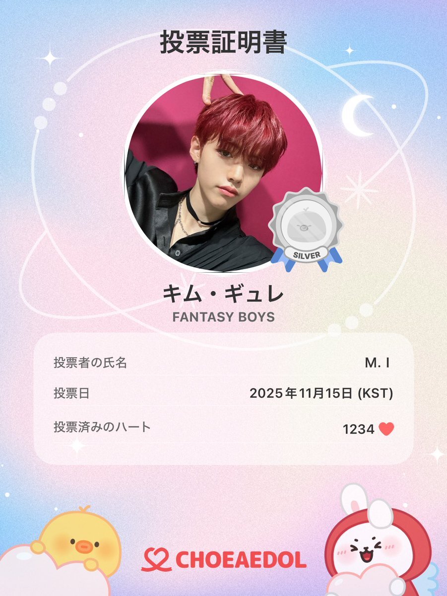 本日投票完了しました💝 一緒に最愛ドルしましょう! #最愛ドル #キム・ギュレ_FANTASY BOYS #投票証明 myloveidol.com/community/?gro… pic.x.com/TXqvEJVNI9