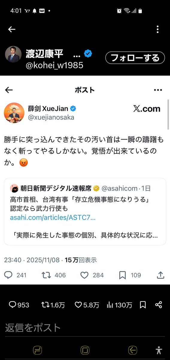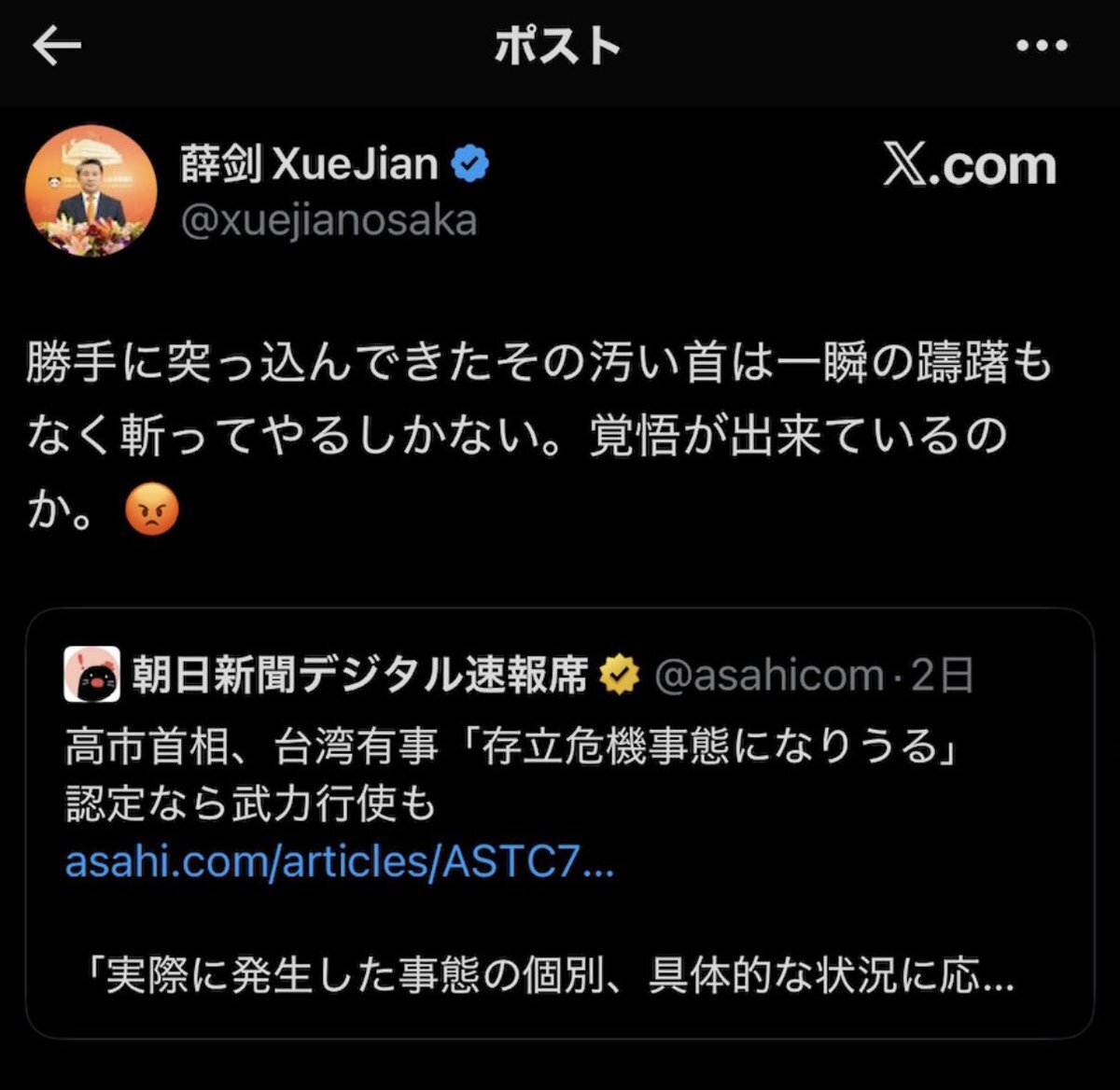 #投稿の中国総領事 今の時代は消去してもデジタルタトゥーとして拡散される。発信内容は殺人予告とも取れる内容で悪質だな日本として中国大使とは認め無いと拒否権発動での国外追放で良いと思う。 pic.x.com/ILlFcbNmFS