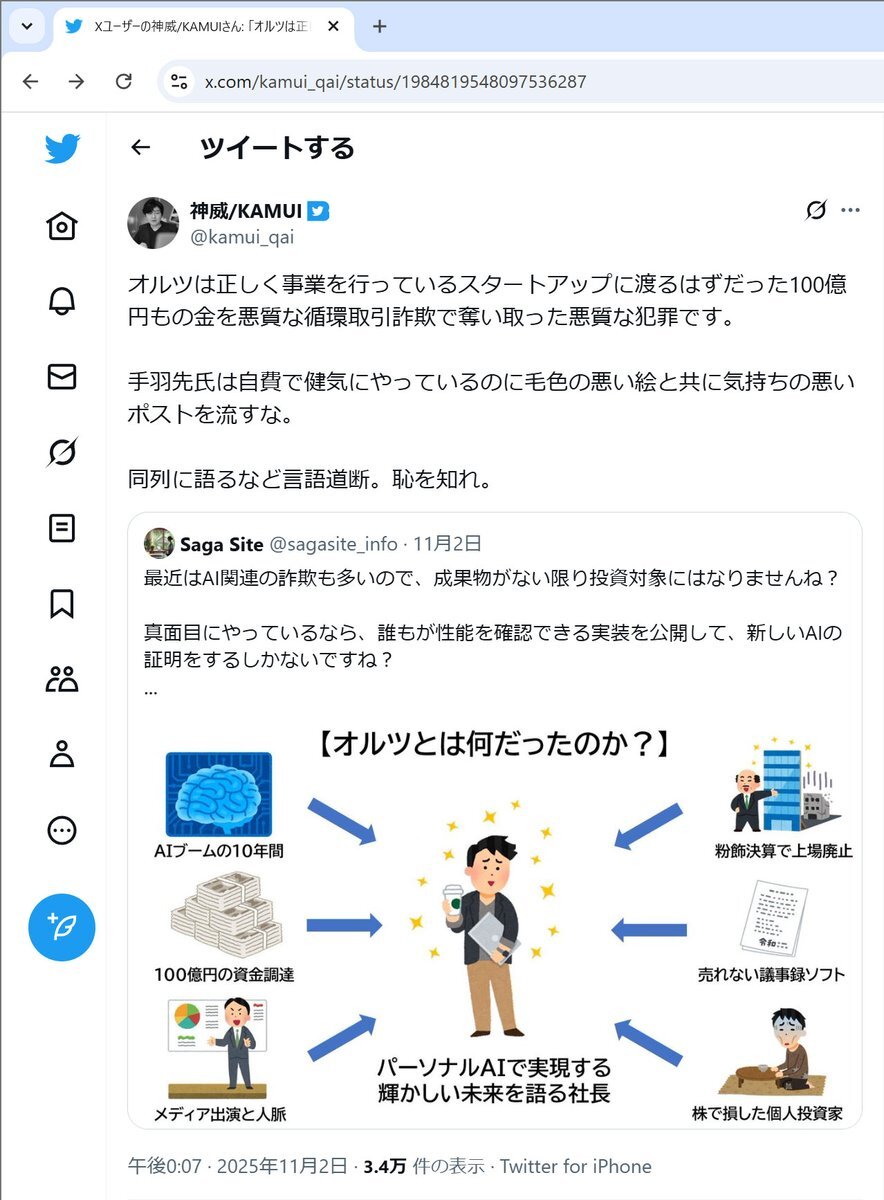 オルツは正しく事業を行っているスタートアップに渡るはずだった100億円もの金を悪質な循環取引詐欺で奪い取った悪質な犯罪です。 手羽先氏は自費で健気にやっているのに毛色の悪い絵と共に気持ちの悪いポストを流すな。 同列に語るなど言語道断。恥を知れ。 x.com/sagasite_info/…