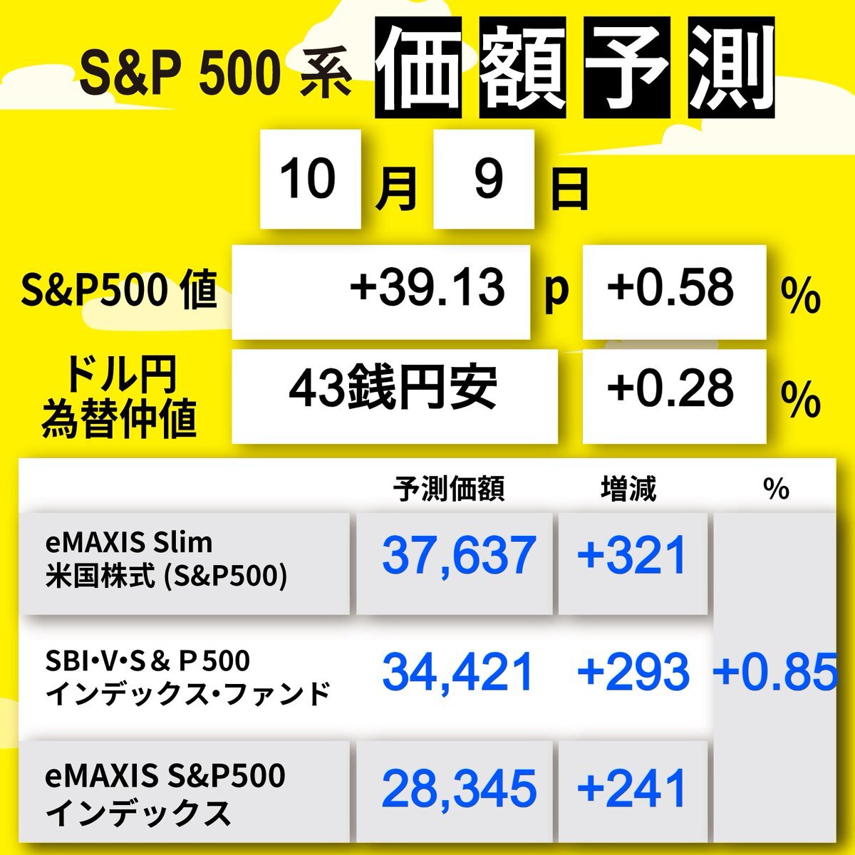 [S&P500系の基準価額予測] ✅本日10月9日は上昇▲の予想 🌿S&P500:▲+39.13p(+0.58% ) ドル円為替仲値:43銭円安(+0.28% ) これを受け ■eMAXIS Slim 米(S&P500) ▲+321円(+0.85% )の 37,637円と予測🌿 他銘柄や詳細はプロフのリンクから🌿 #投資信託 #投資初心者さんと繋がりたい pic.x.com/uwg4sL5pkv