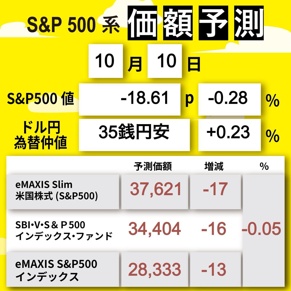 [S&P500系の基準価額予測] ✅本日10月10日は下落▼の予想 🌿S&P500:▼-18.61p(-0.28%) ドル円為替仲値:35銭円安(+0.23% ) これを受け ■eMAXIS Slim 米(S&P500) ▼-17円(-0.05%)の 37,621円と予測🌿 他銘柄や詳細はプロフのリンクから🌿 #投資信託 #投資初心者さんと繋がりたい pic.x.com/ywfCQFwxdU