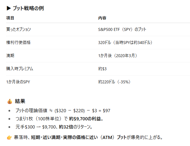下落相場に備えてChatGPTと会話してたら、プットオプションとかいうの出てきて、内容見たらたまげた😮 32倍ってのはまあ理論値みたいなもんだとしても、下落時の対策はちゃんとあるんだなと安心。 むしろ下落の方が短期間で終わる分、稼ぎとしては美味しいのでは… #投資家さんとつながりたい pic.x.com/ghIAs6zko4