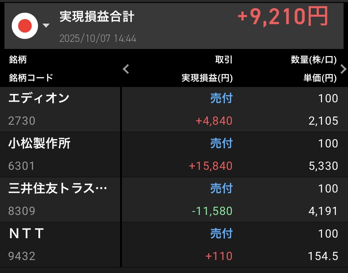 📈10/7のトレード 短期用のコマツと三井住友トラストGを処理、長期用に買ってたNTTとエディオンを利回り調整のために入れ替え。 代わりにKDDI、リョーサン菱洋HD、マースグループHDを購入! ご祝儀相場も落ち着いた感じなので、スイング銘柄の物色も再開します💪 #投資家さんと繋がりたい pic.x.com/svgKyo1RJa