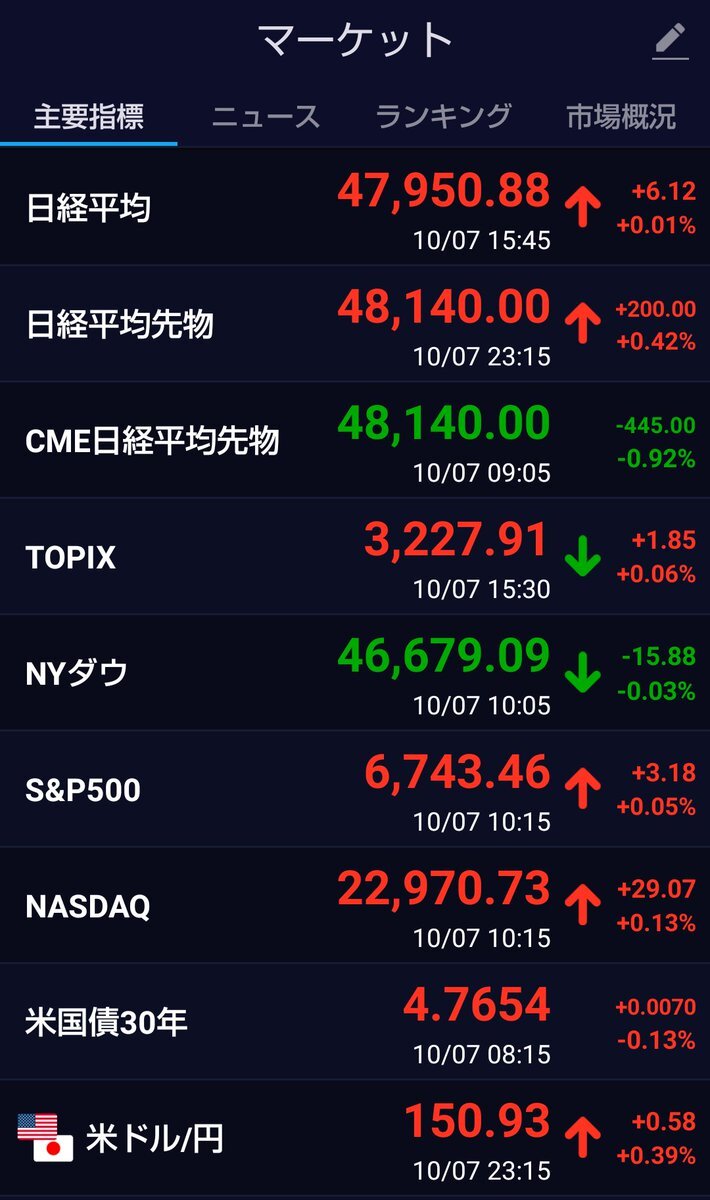 【相場情報】 10月7日の日経平均は47,950円台で小幅⤴️ ✅TOPIXも小幅⤴️ ✅日経平均先物は48,000円台を維持⤴️ ✅米国市場はまちまち⤵️⤴️⤴️ ✅米ドル/円は150円台で円安基調🤨 ✨明日も高値圏をキープか🤔⁉️ #株友 #株クラ #資産運用 #投資初心者 #投資家さんと繋がりたい #おっきくなぁれ株友の輪 pic.x.com/Gux9jSCekG
