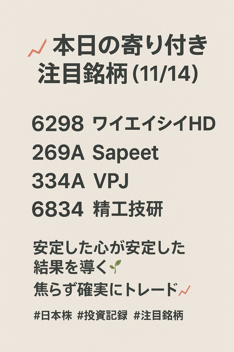 📈本日の寄り付き注目銘柄(11/14) 6298 ワイエイシイHD 269A Sapeet 334A VPJ 6834 精工技研 安定した心が安定した結果を導く🌿 焦らず確実に前進しよう📈 #日本株 #投資記録 #注目銘柄 #株式市場 pic.x.com/6FlyrZY3iZ