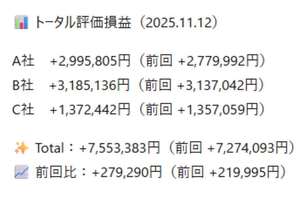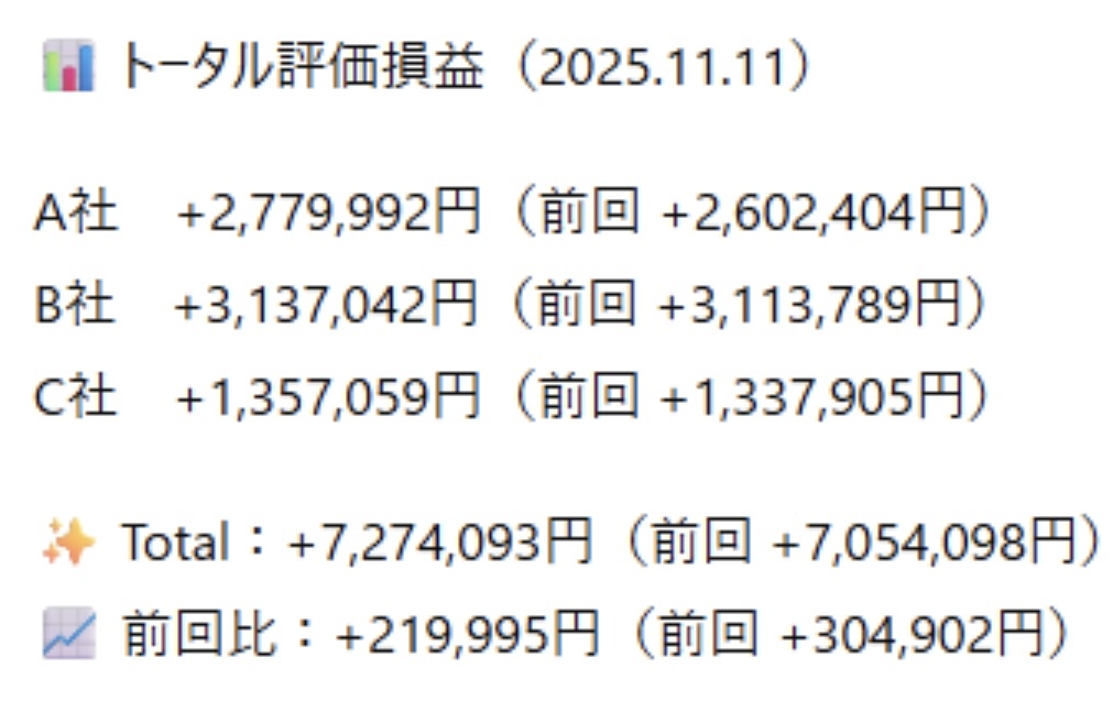 251112(水) #投資記録 トピ△1.14% 3,359P 最高値更新 日経△0.43% 51,063円 グロ△2.48% 727P PF△2.03%(159,250円) $NVDA 下や決算後SBG↓受け半導体株↓ PF MTG △19% 決算◯でS高 TENTIAL △6%
