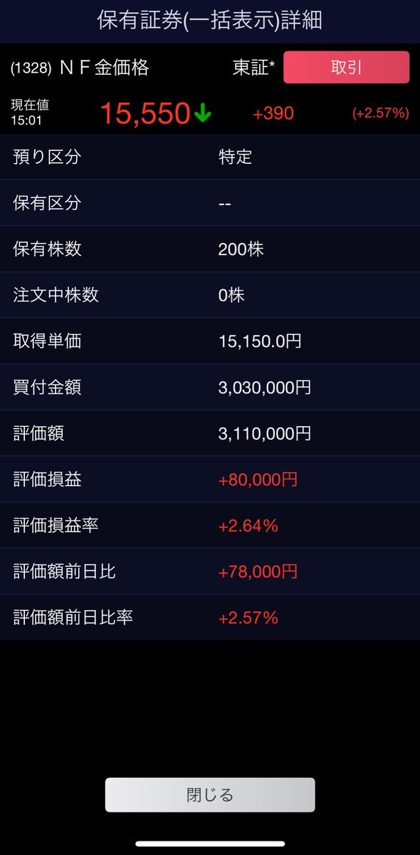 眠い眠い寝起き5分で利確して二度寝 1328 NF金価格、+8万円の含み益。 やっぱ金は強いわ。 #ゴールド #金ETF #資産運用 #SBI証券 #投資記録 pic.x.com/GRAp8XubZn