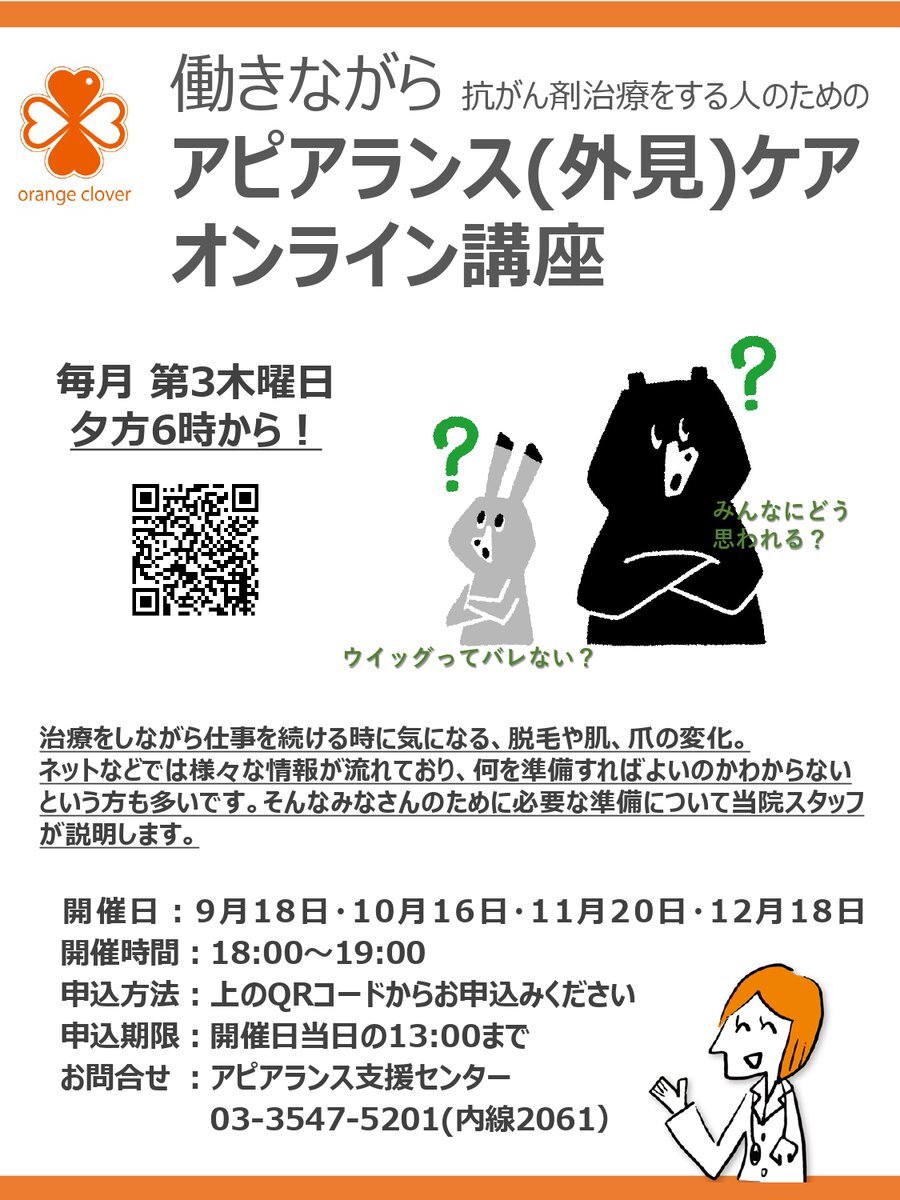 国立がん研究センター中央病院 様より 「働く人のためのアピアランス(外見)ケア講座」 日時:11/20(木)18:00-19:00 会場:Zoom 対象:がん治療中の方、これから治療を開始する方(他院受診の方も可) 詳細:x.gd/Yy8Iq #抗がん剤副作用 #アピアランスケア pic.x.com/cEvXJ5J8vx