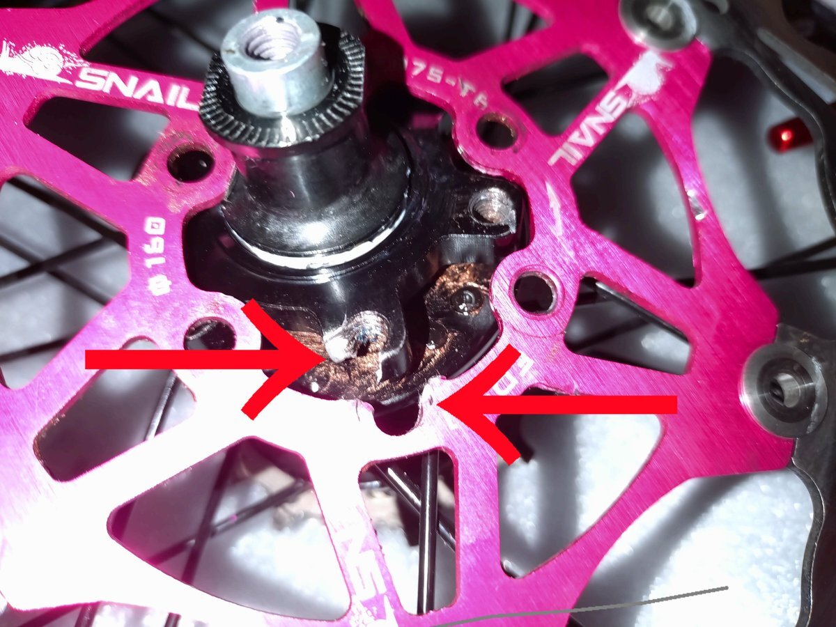 14インチのリアホイール、ディスクブレーキを留めたM5チタンボルトが、異物拾った衝撃でアルミ7000番代ディスク台座もろともSUS製ディスクを割り共に千切れ飛んだ事例。小径車だとこうトラブルのか〜って学びです。発生は香港滞在初日🇭🇰#ミニベロ #折りたたみ自転車 pic.x.com/IyryMs8Cze