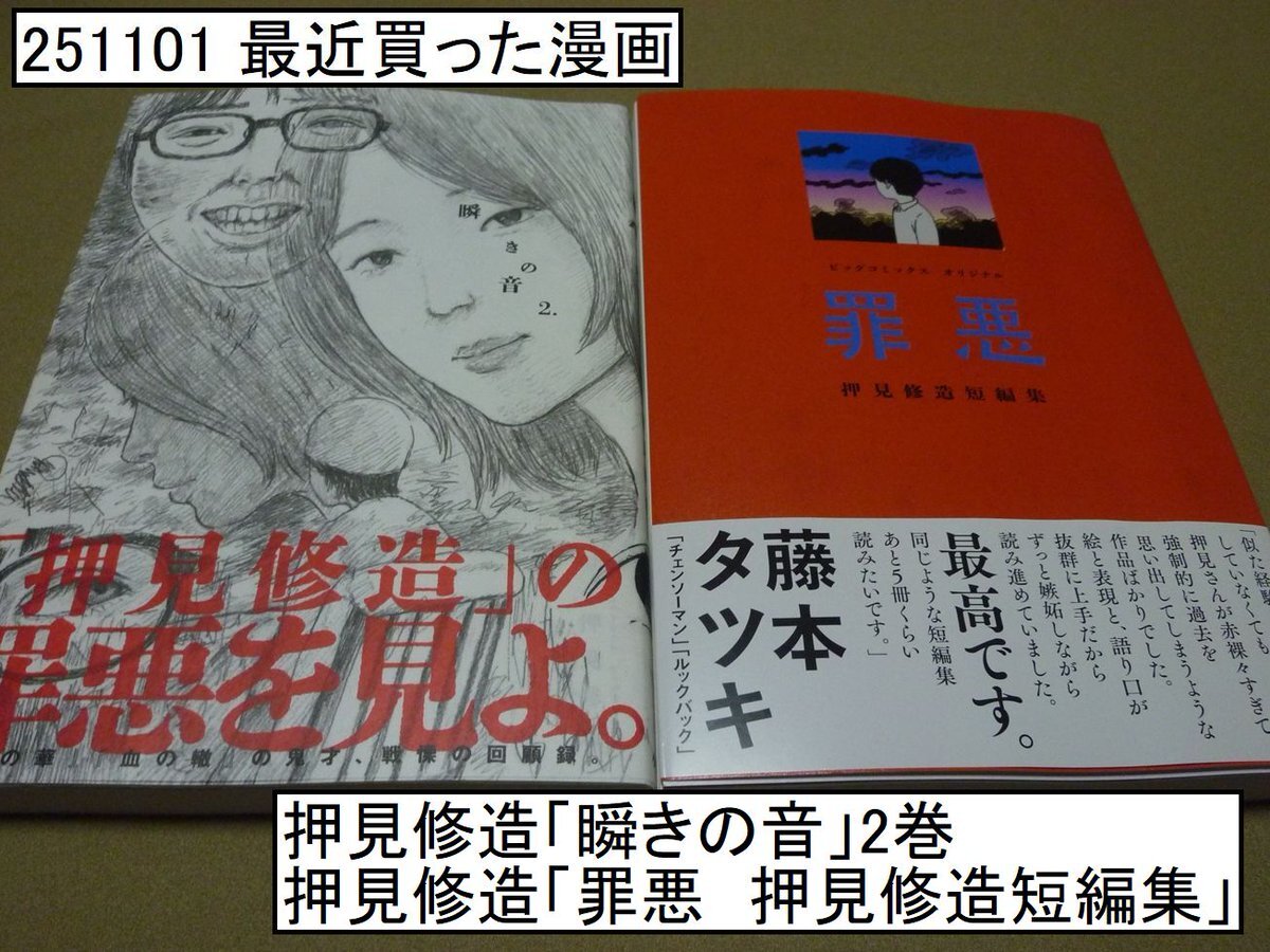 #最近買った漫画 #押見修造「瞬きの音」2巻 押見修造「罪悪 押見修造短編集」 「瞬き~」は押見修造の自伝的漫画の2巻。 表紙のメガネくんが 僕とちょっと似ていて もやもやするなぁ。 「罪悪」は短編集なのに これも自伝的漫画集で 青春期のどろどろを描いていて 胸にちくちく刺さるものがある pic.x.com/1nDTdWLu2k