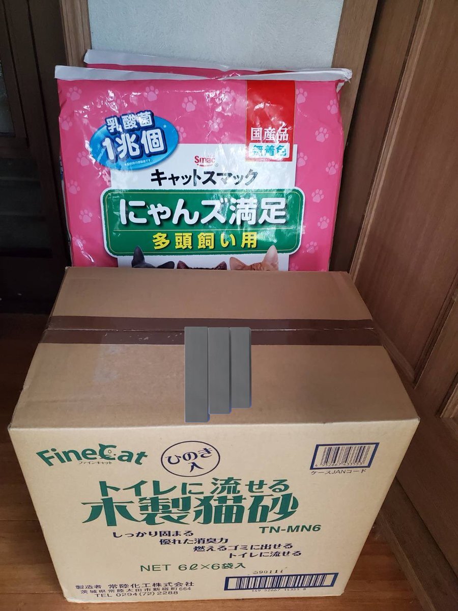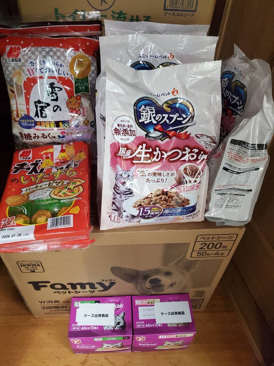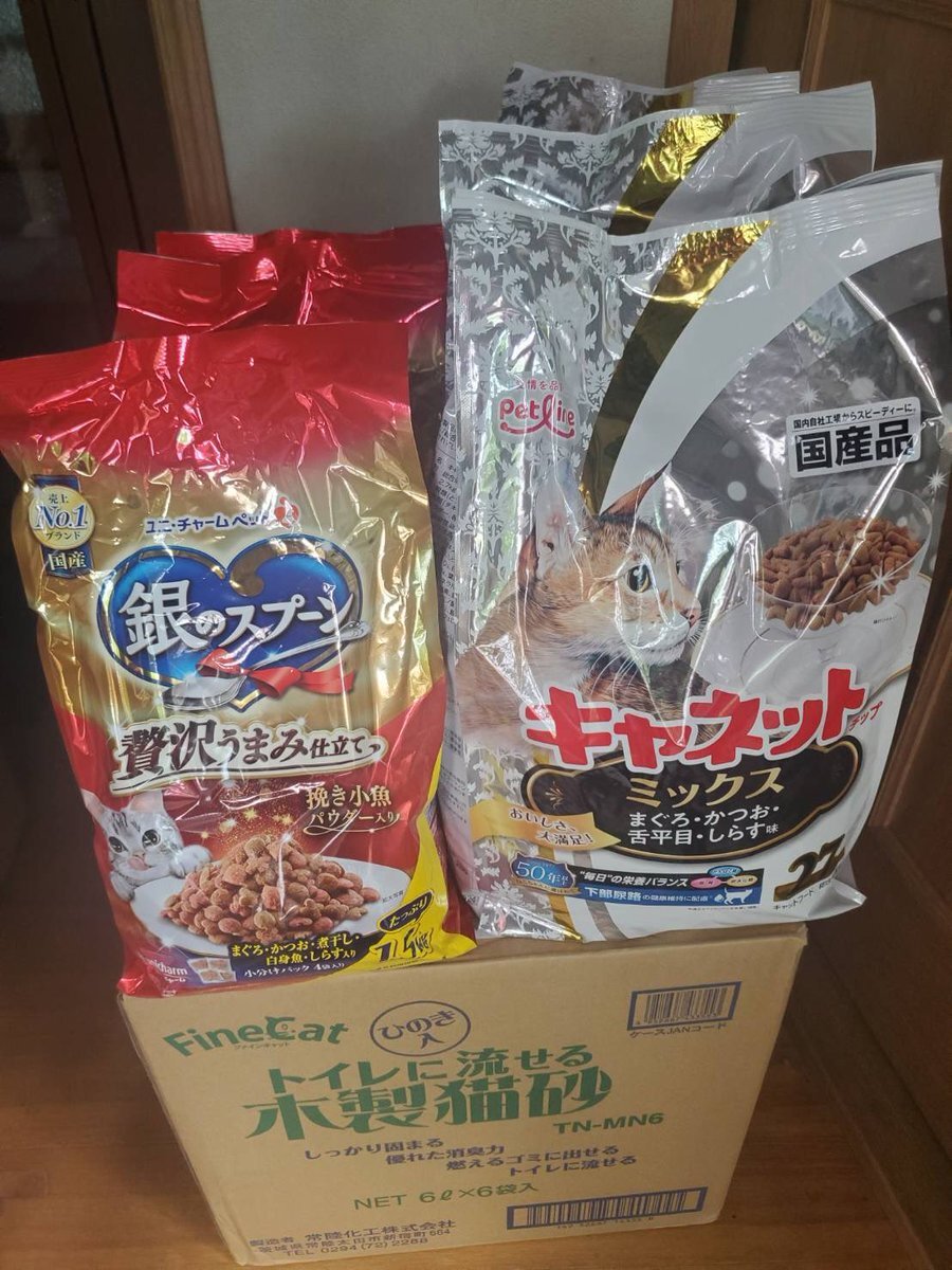 K・Y様よりキャットフードと猫砂いただきました🍚🚽いつもありがとうございます🙇とても助かります。 先日ツイートしました、長野県下諏訪で迷子だったハチワレちゃんですが、お家に帰れた様です。拡散のご協力ありがとうございました🙇⤵️