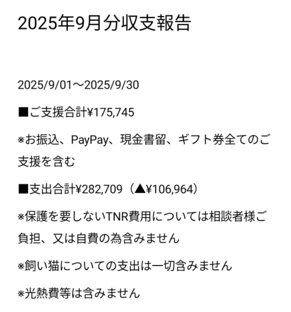 COCOねこより🐾 【2025年9月分収支報告】 いつも温かく支えて頂き誠にありがとうございます。皆様のお力添えによりこの活動が継続して行えております事を心より感謝申し上げます。 今現在、昨今の物価高騰により厳しい運営状況が続いております。 引き続き応援の程宜しくお願い申し上げます。