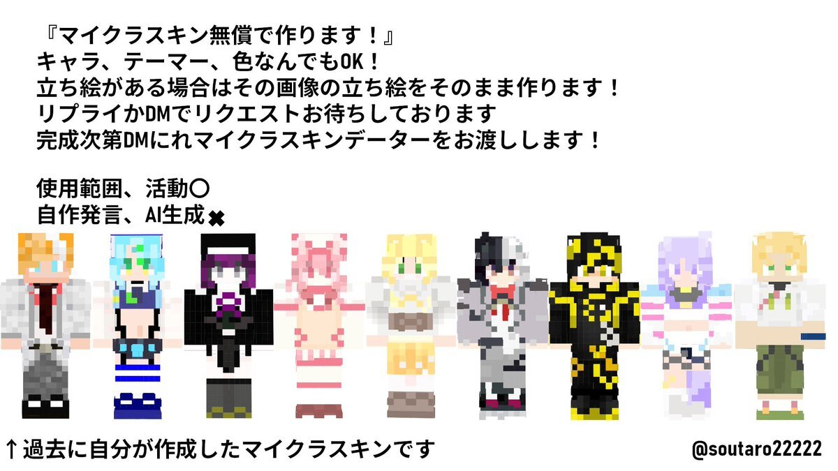 『マイクラスキン無償で作ります!』 詳しいことは元ツイートにて記載しております ご依頼お待ちしてますm(__)m #拡散募集 #Minecraft #Vtuber #無償依頼 #マイクラ #マイクラ実況者 #配信者さんと繋がりたい x.com/soutaro22222/s…