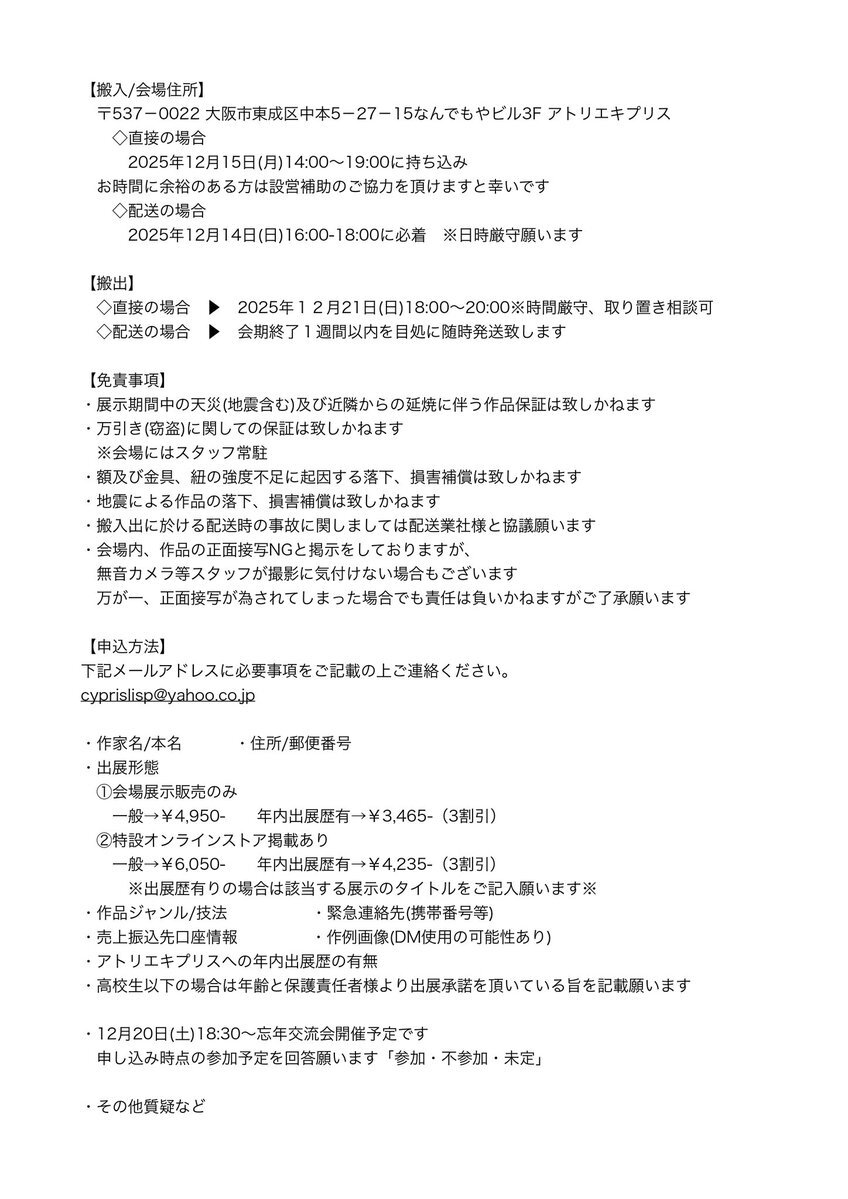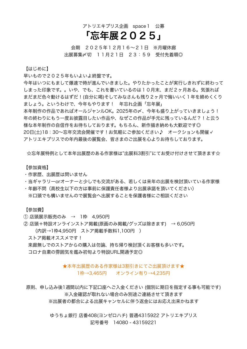 出展作家募集開始🎨 毎年恒例、キプリスの1年を締め括る #忘年展 開催決定! _ 期|12月16-21日 費|¥3,465〜 ※年内出展歴で3割引 _ 本年制作の作品にてお気軽にご参加ください◎ 作品テーマ縛りはございません。 年の最後に、楽しい展示を開催しましょう! 20日(土)18:30~忘年会開催🍻 #拡散希望 pic.x.com/FhCW6U0PXk